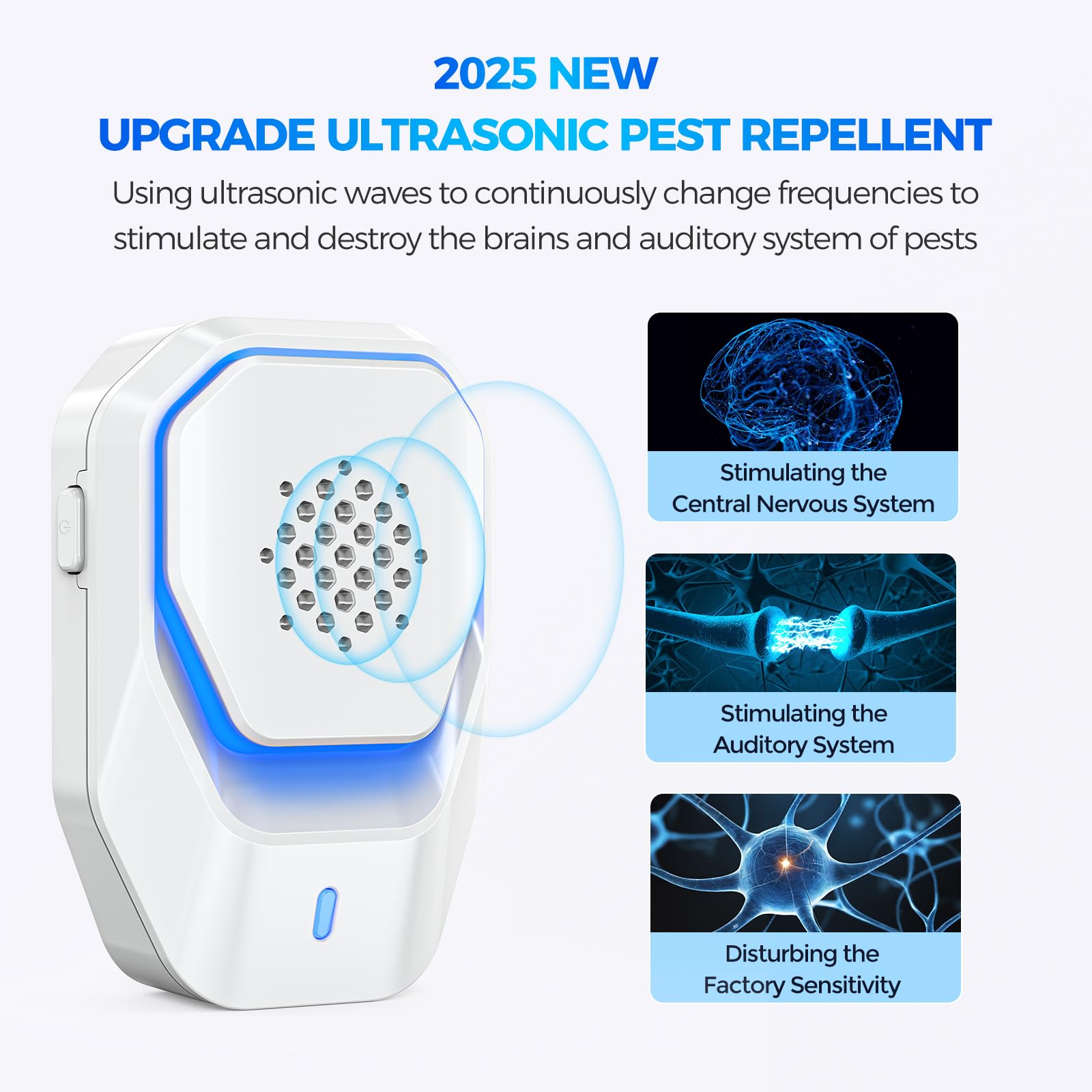 Upgraded ultrasonic pest control repeller: The mouse repellents ultrasonic plug-in stimulate the brain and auditory system of fleas, rodents, roaches, mice, insects, mosquitoes, ants, rats, bed bugs and other insect pests, thus causing them to run away from your home