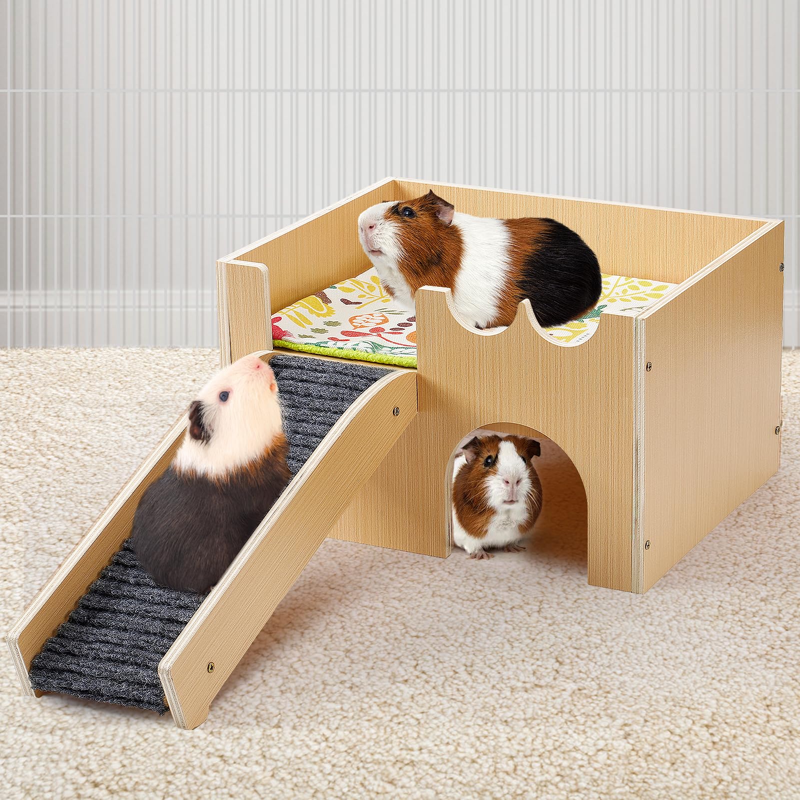 DURABLE & RELIABLE : The guinea pig hideout is crafted primarily from natural wood, ensuring safety and eco-friendliness, and providing exceptional stability. The double-sided mat, soft, washable, and reusable, is placed on the roof, creating a cozy habitat for guinea pigs.