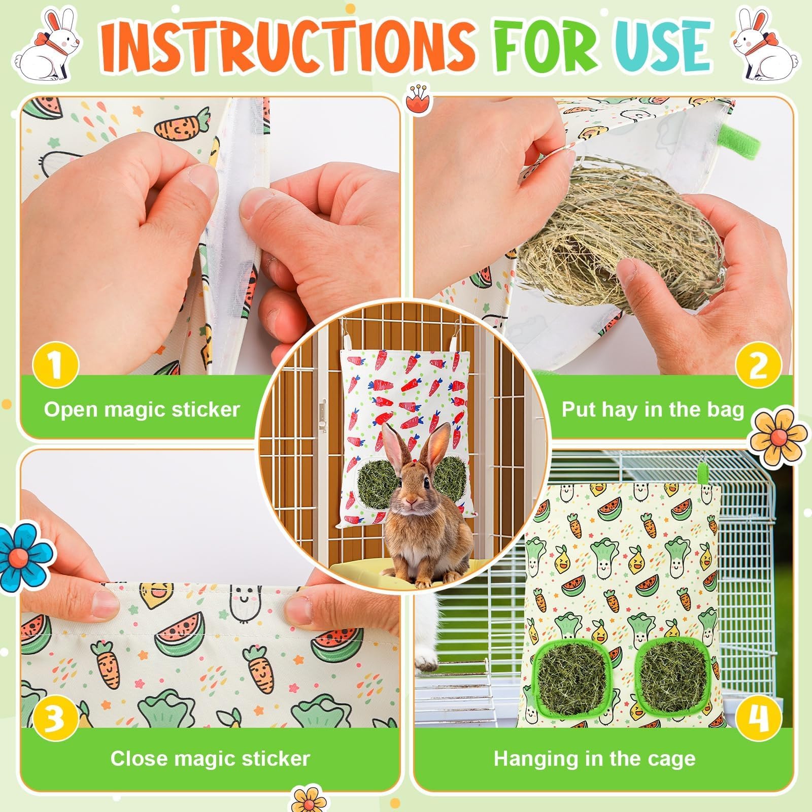 Easy to Use: The hay bag for rabbits is easy to open and take. You only need to open the magic tape of the bunny hay feeder, and then you can add hay. In addition, the hay holder for rabbits is light, foldable and easy to carry and store, which is convenient for you to provide hay for your pet anytime and anywhere, making feeding easier