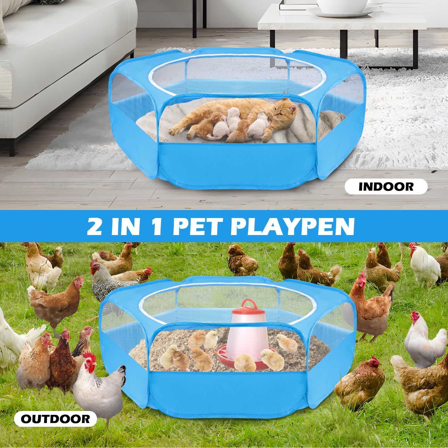 1.MULTI-PURPOSE: Our pet playpen is suitable for kittens, puppies, bunnies, chicks, hamsters, chinchillas, ferrets and other small animals. Not only can it be placed indoors as a place for small animals to play and rest, a brooder box for newly born pets, but also can be taken outdoors for them to sunbathe. The large space allows them to enjoy a cozy and spacious environment inside.