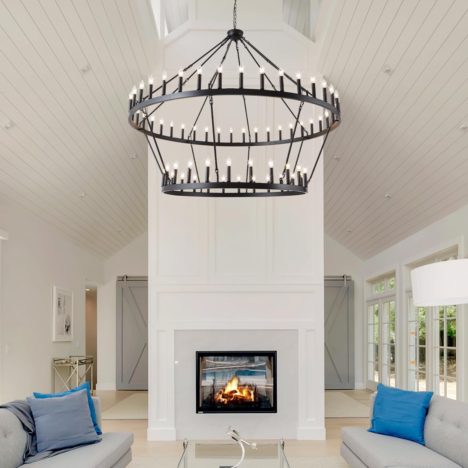 VBKK Wagon Wheel Chandelier Farmhouse 2 Tier 64-Light 70-Inch, Black Industrial Chandelier Rustic Candle Pendant Light Fixture Extra Large for High Ceilings, Dining Room, Living Room, Foyer, E12