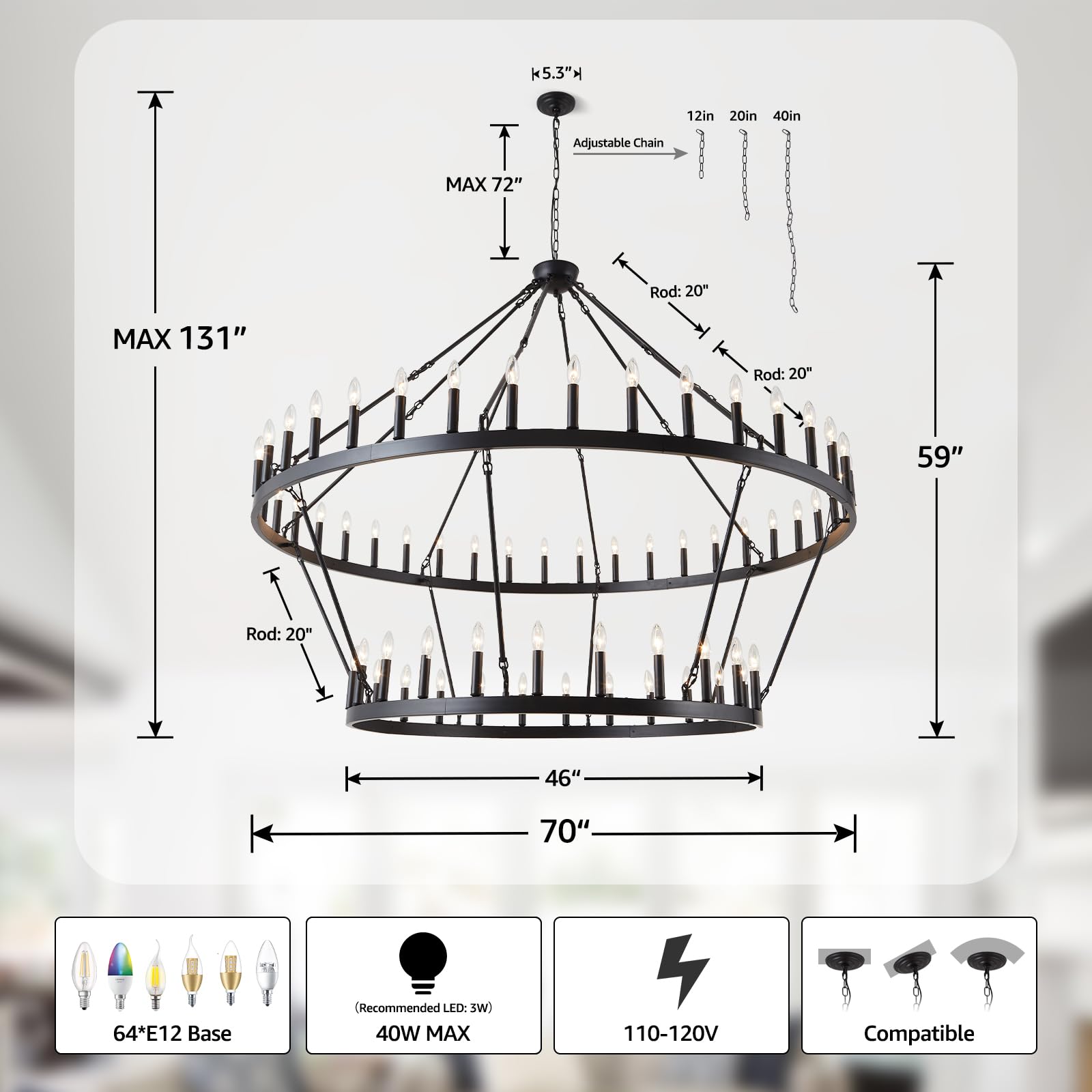 Extensive Bulb Compatibility: The extra-large wagon wheel chandelier features a two-tier design. The first tier includes 40 E12 lamp holders, and the second tier has 24 E12 lamp holders, totaling 64 bulbs required (BULB NOT INCLUDED). The industrial large chandelier is compatible with various types of E12 bulbs, including Edison, incandescent, halogen, LED, etc