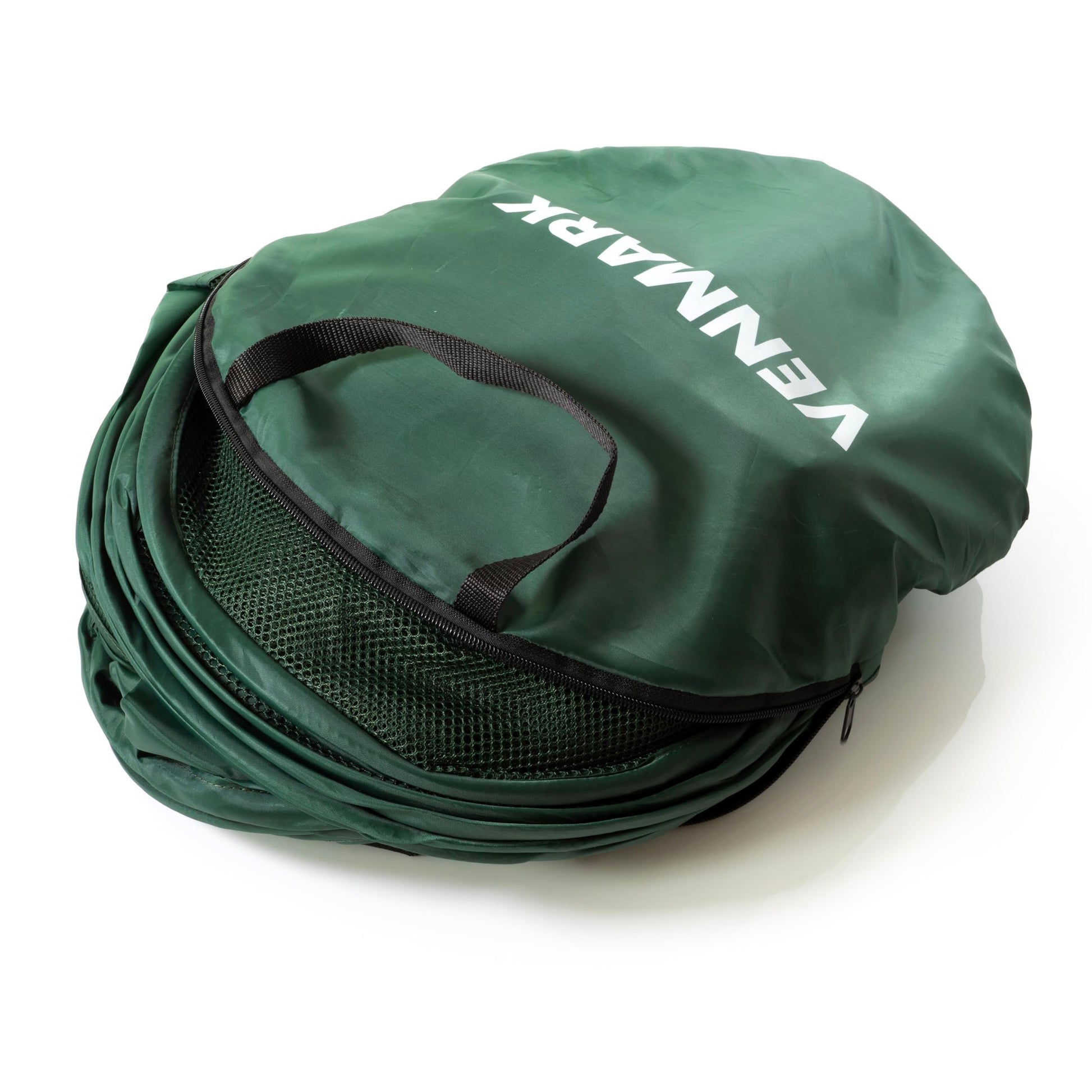 When pulled out of the carrying bag, the tent automatically unfolds itself with minimal set up. It can then be folded back into the carrying bag for easy travel and storage. The dimensions of the packed carrying bag are 15” x 15” x 4”.