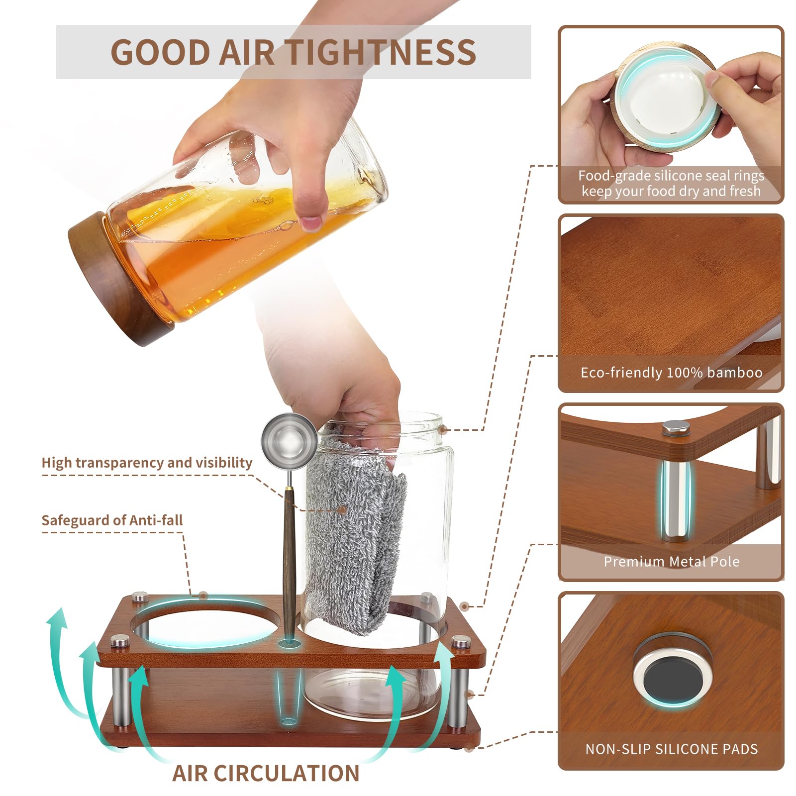 【Metal Spoon & Thread Lid with Airtight Seal】Wooden lid with internal threads and silicone sealing for better sealing and leak-proof function to keep food clean, dry, and fresh for long-term storage. Includes a metal spoon with a wooden handle for easy measuring and dispensing, which can be placed directly on the bamboo holder without creating a mess.