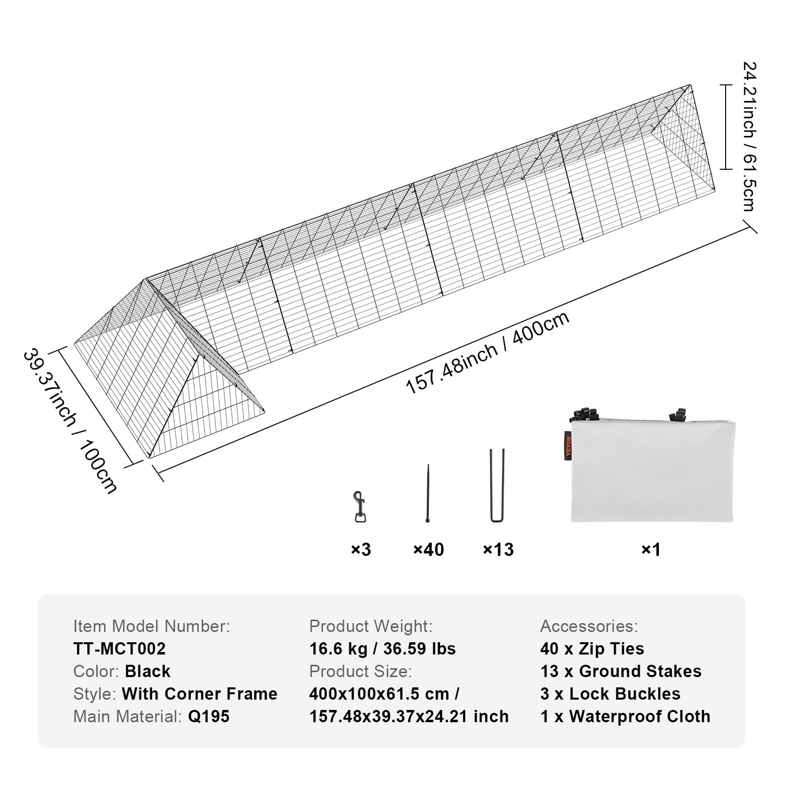 Portable & Large Activity Area: Still worrying about your chicken ruining your vegetable garden? VEVOR chicken tunnel enclosure will protect them from your garden, and they can freely run back and forth. Providing a wide activity area measuring 39.37" wide and 24.2" tall, the VEVOR chicken tunnel offers poultry greater freedom. With a free-range lifestyle ensuring healthy growth, ample space allows them to enjoy a more natural environment.