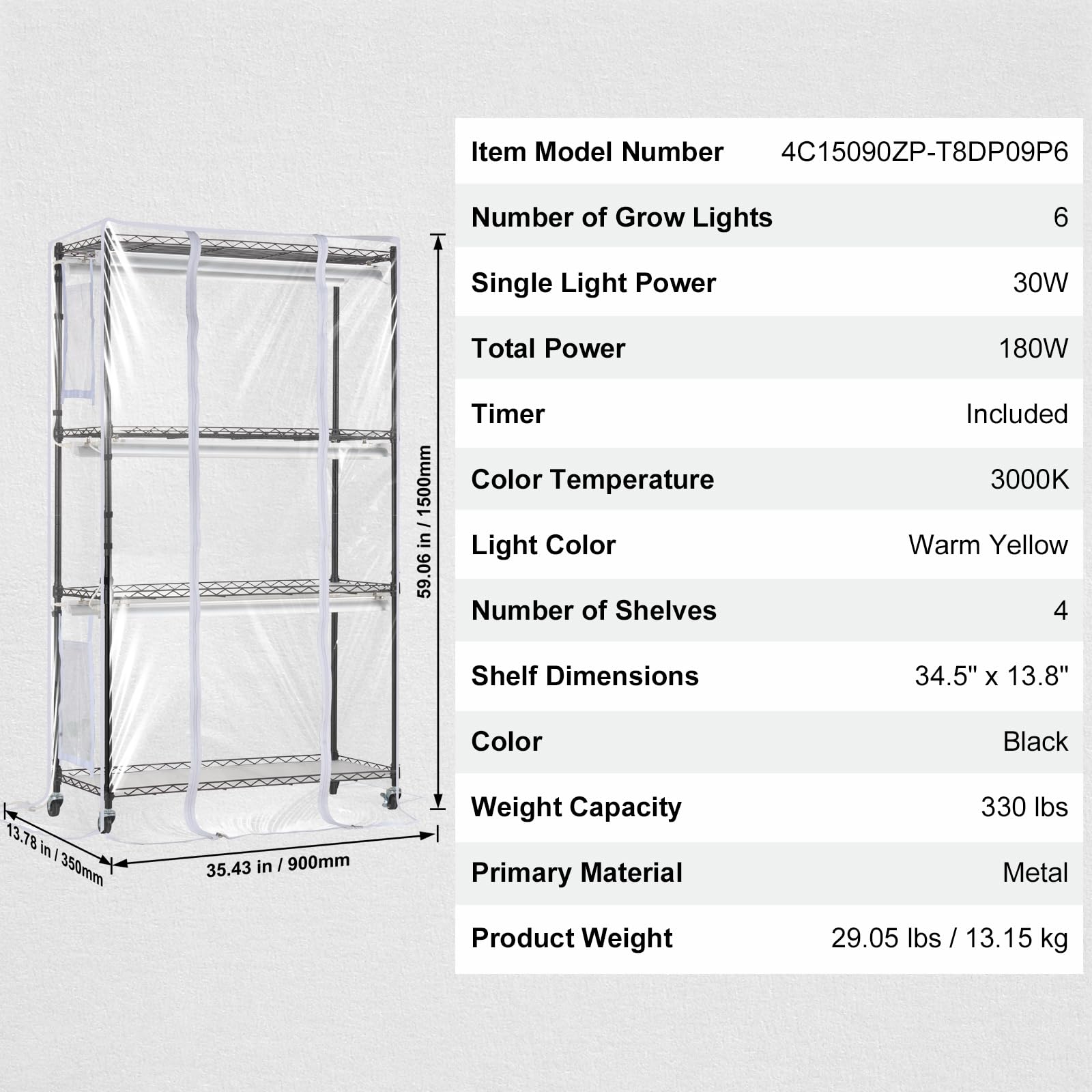 Convenient and Secure Design: The indoor greenhouse comes with adjustable grid height that accommodates plants of various sizes. Four heavy-duty industrial wheels make moving the rack effortless. The PP pads have a leak-proof design to avoid the light fixtures from water damage, enhancing security and usability.