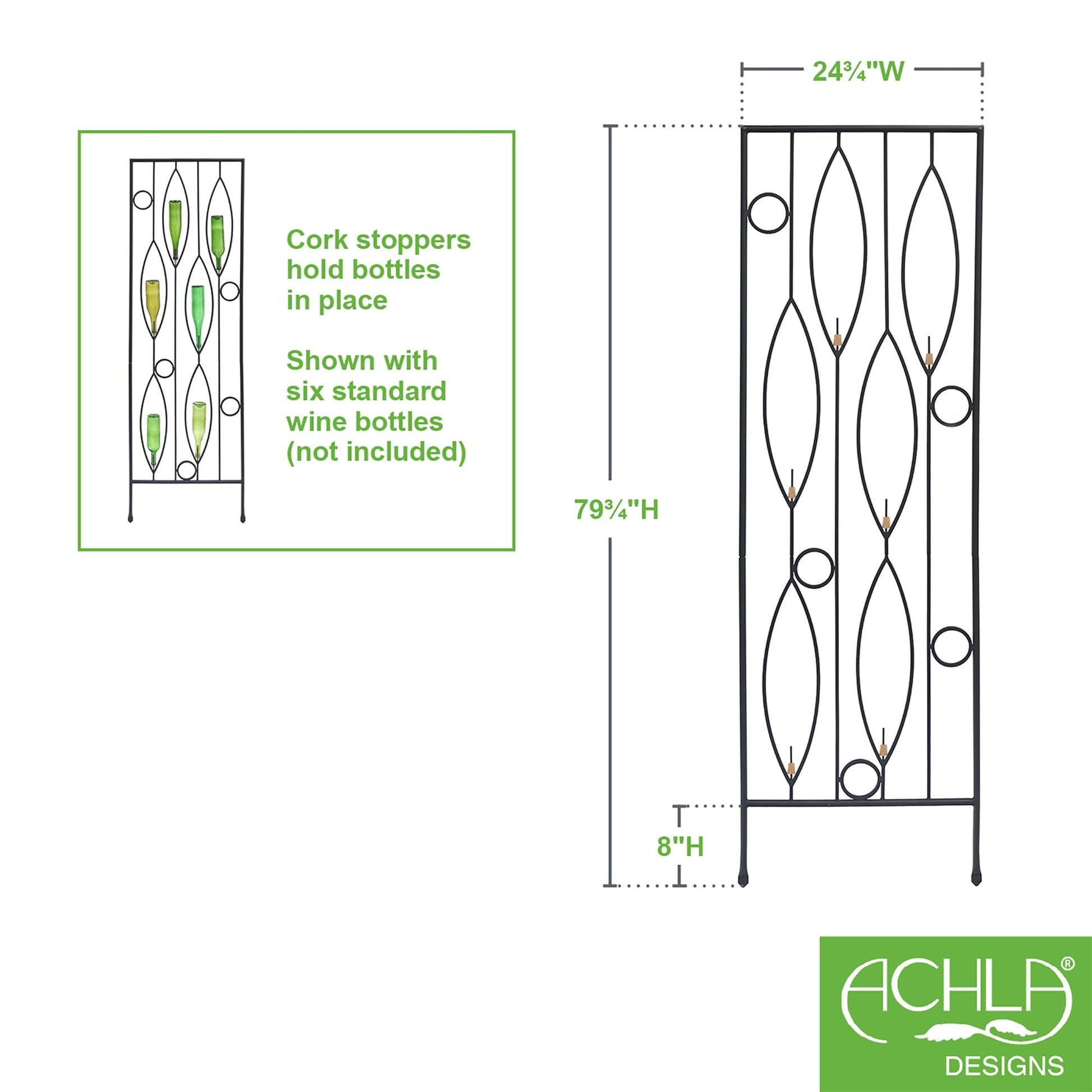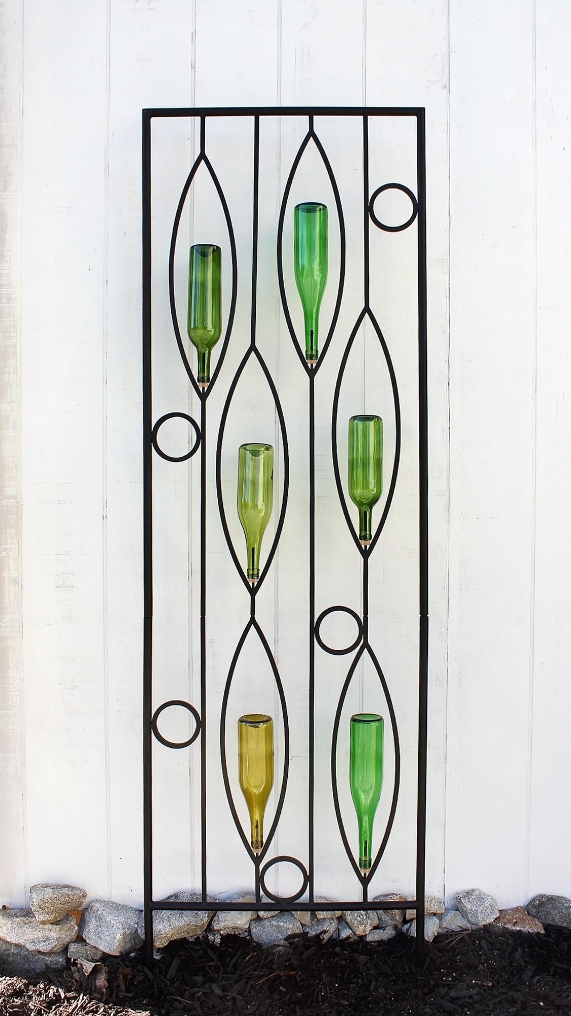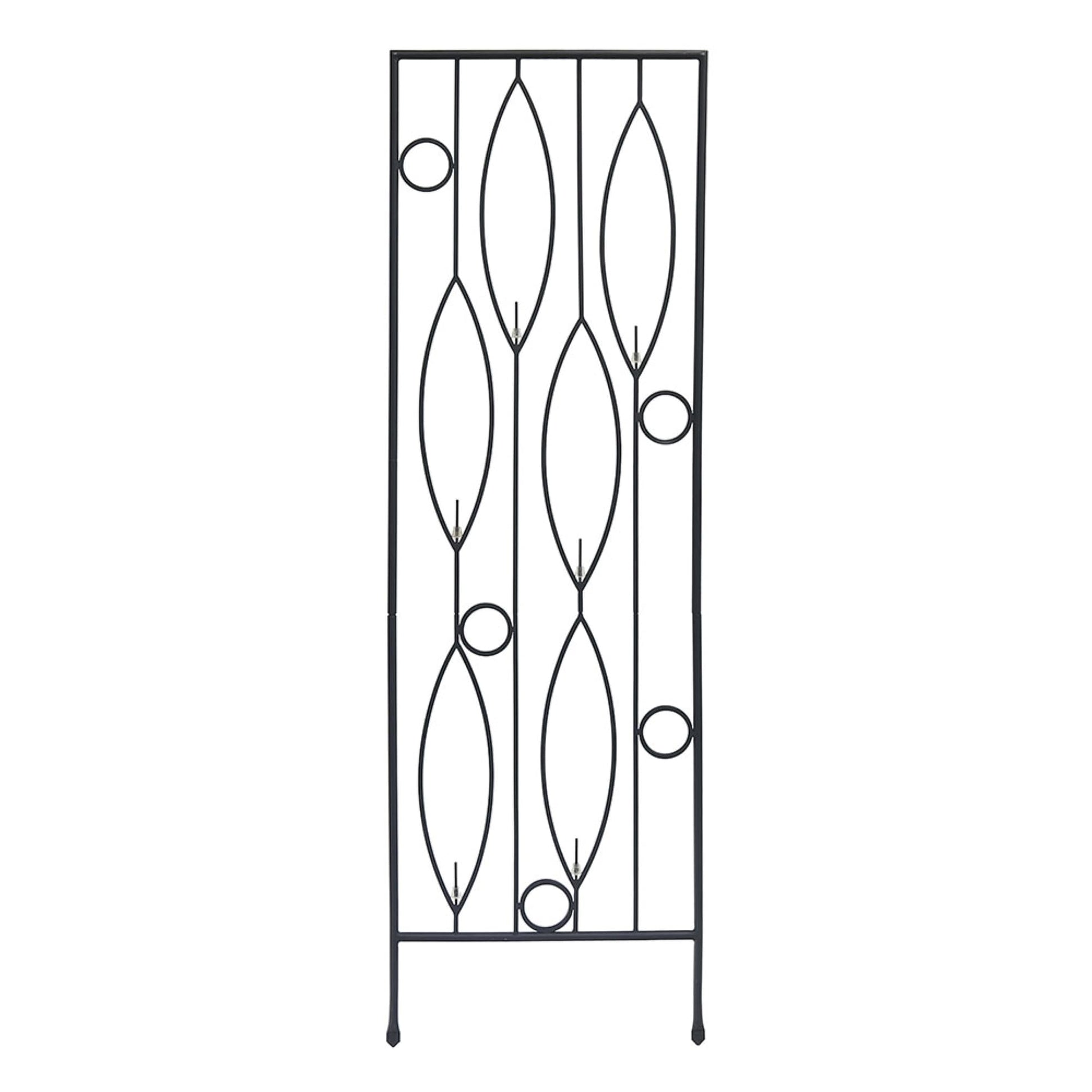 Contemporary design meets the classic vintage wine bottle fence in our Vinifera Bottle Trellis. The leaf and circle pattern has space for six colorful glass bottles of your own choosing, each with rod and stopper to secure the glass in place.