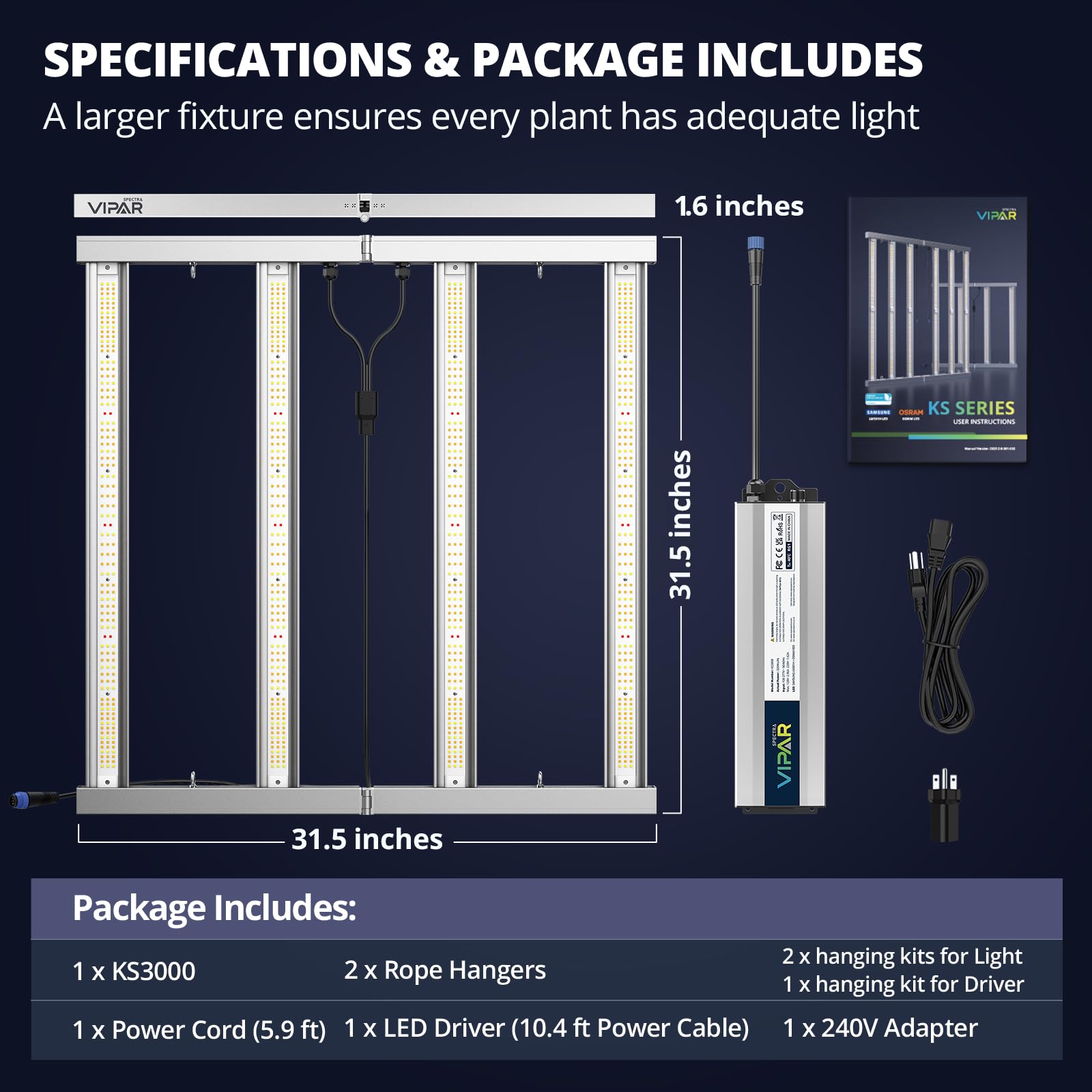 Maximize Yields, Minimize Costs: KS3000 LED grow light uses Samsung LM301H (3.10 μmol/J) & efficient 660nm diodes for higher efficiency, ideal for personal/commercial growers to provide optimal yields & quality crops while drawing only 320W for 3x3 grow tent