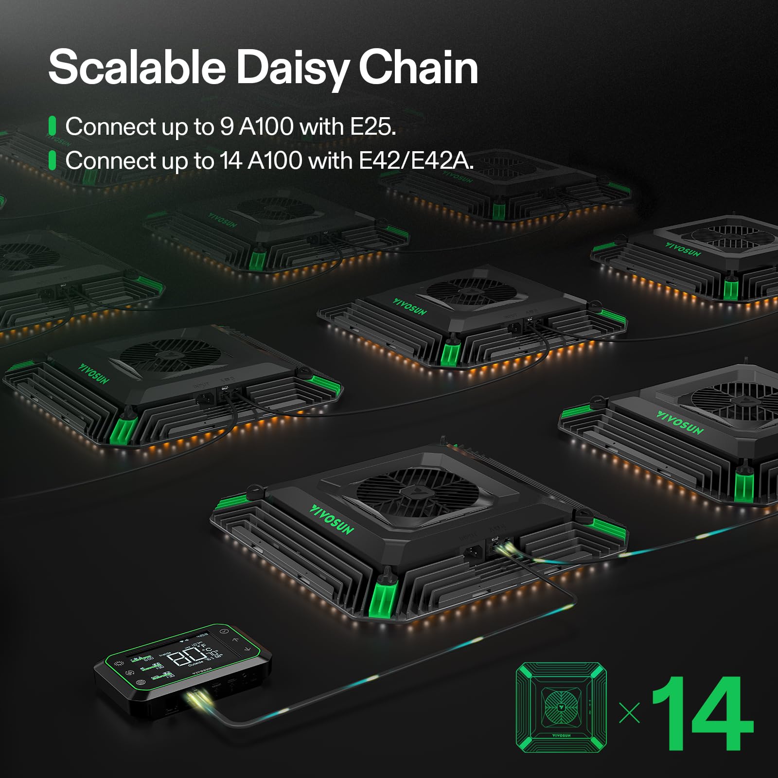 • Integrated Circulation Fan: The centrally located circulation fan in the LED balances airflow where other fans cannot reach, allowing more air to enter the canopy directly; To unlock additional features, the fan must be used with the Vivosun Growhub Controller (E42, E42A, or E25), available for separate purchase
