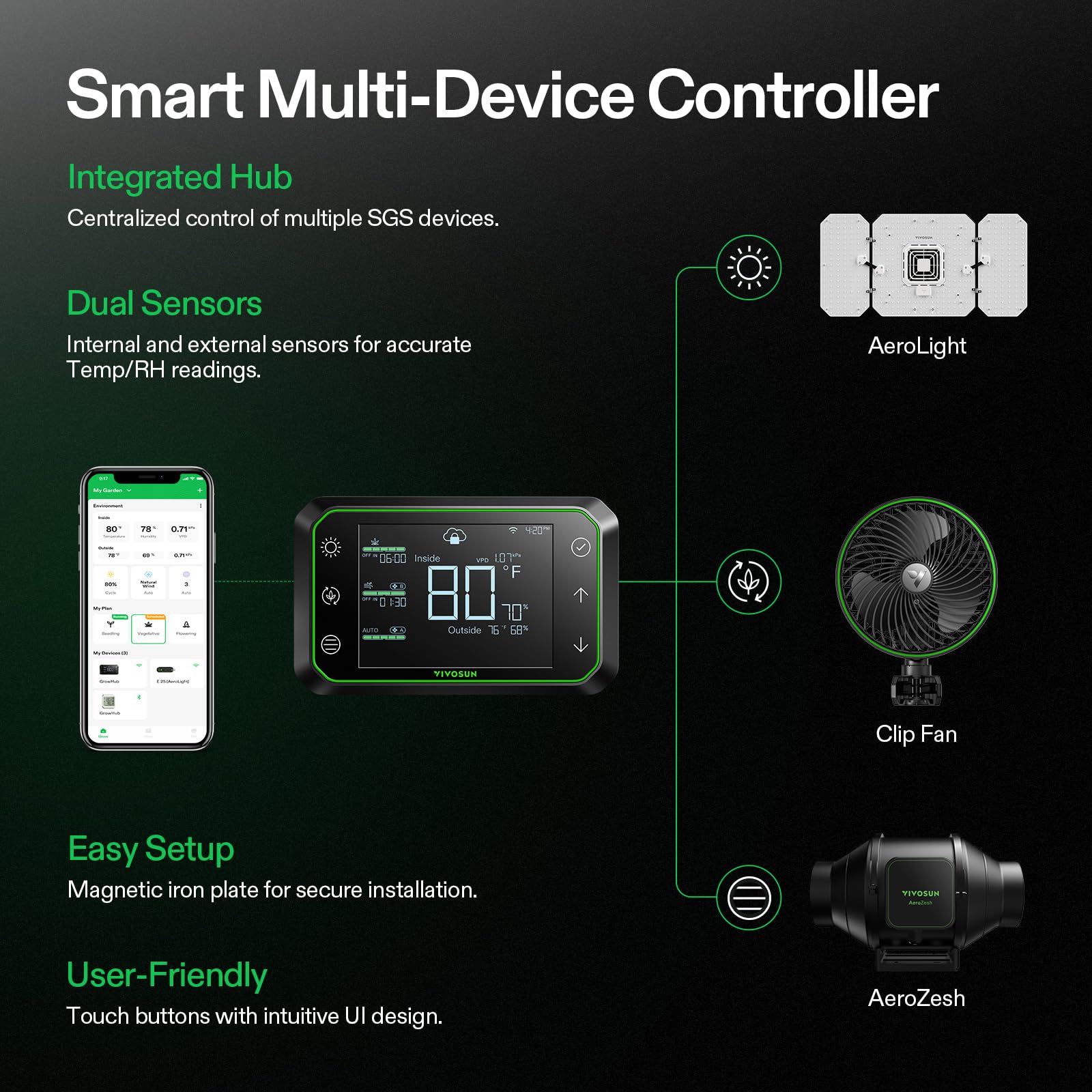 GrowHub Controller: The GrowHub Controller is the core of Vivosun's Smart Grow System, it centrally manages all tent equipment and offers a user-friendly interface for easy operation; Compatible with various devices and platforms, it features automated Grow Recipes that support plant growth from seed to harvest