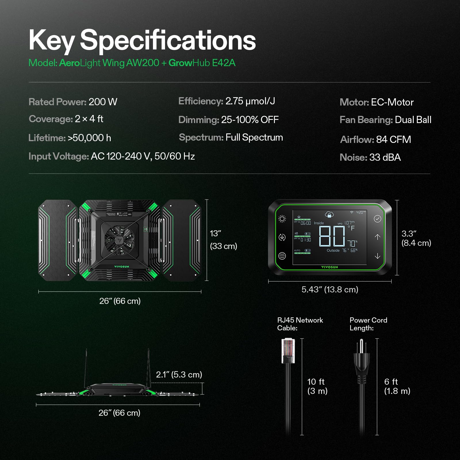 Integrated Fan Light: The AeroLight Wing 200W foldable LED grow light features a built-in circulatory fan for enhanced canopy airflow fostering a balanced environment; Crafted with 301B Diodes, a dimmable driver, and a sun-like full spectrum, this light is ideal for all plant growth stages; With full programmability and adjustability, it offers a tailored lighting experience for your specific cultivation needs
