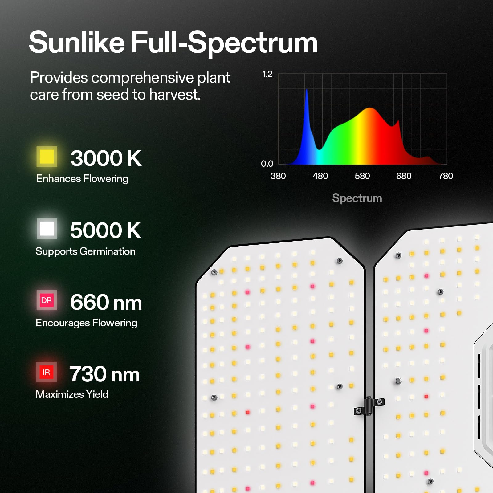 Full-spectrum Sun-like Lighting: Featuring a dimmable driver, and full-spectrum lighting, this light is ideal for various plants at all growth stages; It delivers optimal full-spectrum light (390nm-730nm, 3000K, 5000K); This feature maximizes PAR output, improving germination rates, promoting plant growth, extending blooming periods, and increasing yields