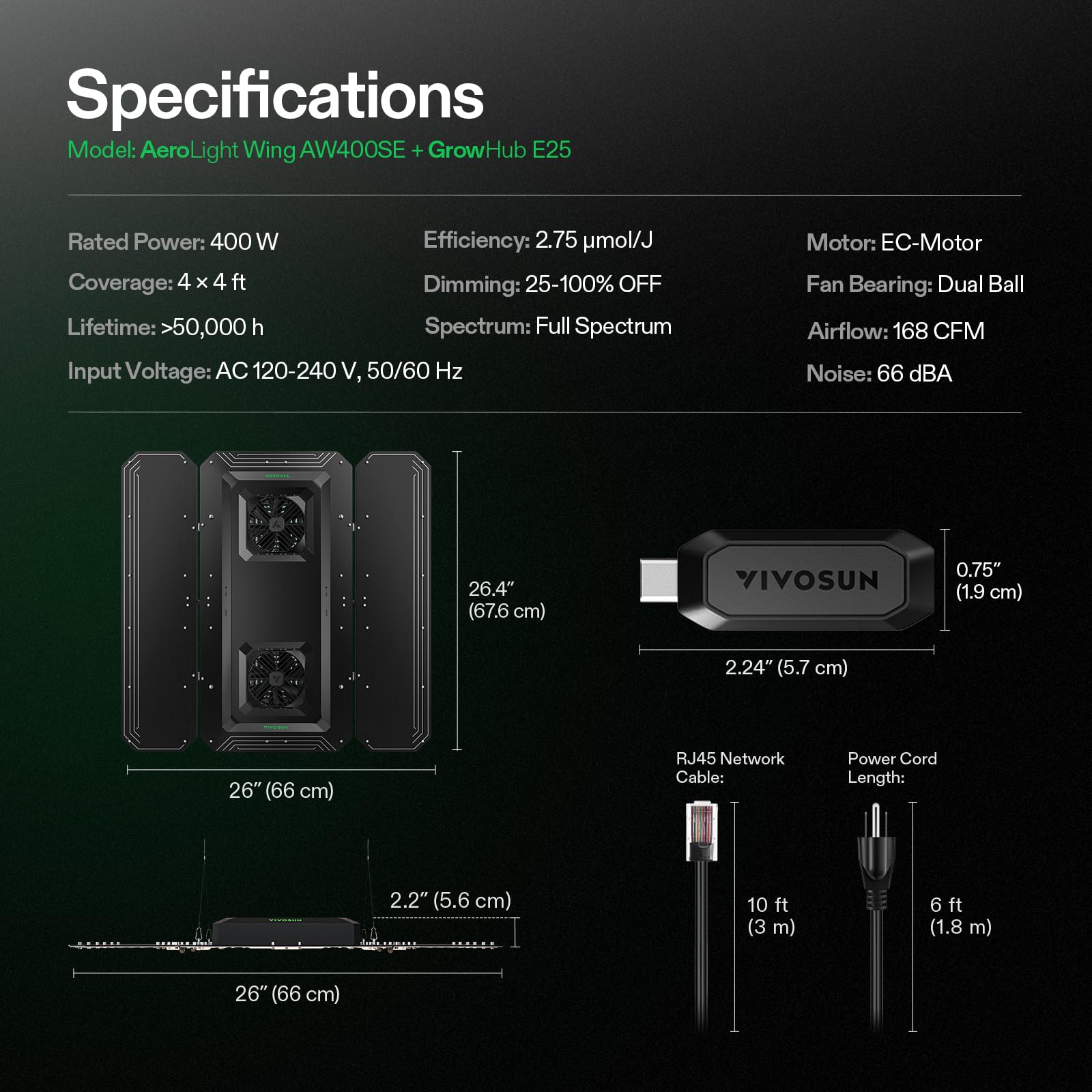 Integrated Fan Light: The AeroLight Wing AW400SE grow light features a built-in circulation fan for enhanced canopy airflow, balancing temperature and humidity; It boasts a unique foldable-wing design for versatile light distribution; Superior heat dissipation extends its lifespan to over 50,000 hours