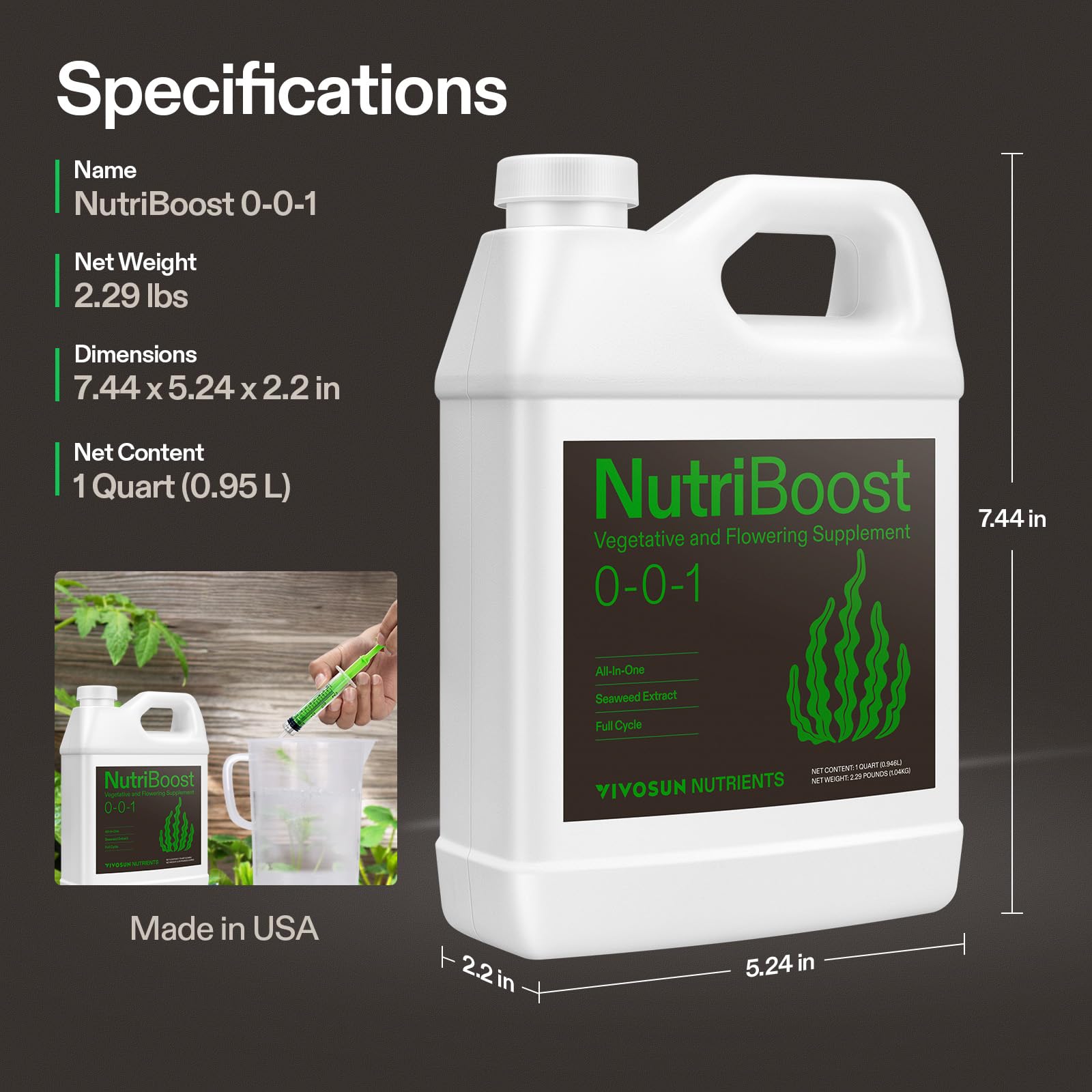 • All-in-One Additive: NutriBoost is a premium additive formulated with high-quality ingredients, including natural kelp extract, carbohydrates, and essential minerals; This rich blend provides comprehensive nutrition, promoting vigorous growth at every stage while simplifying your plant nutrient regimen with a single product