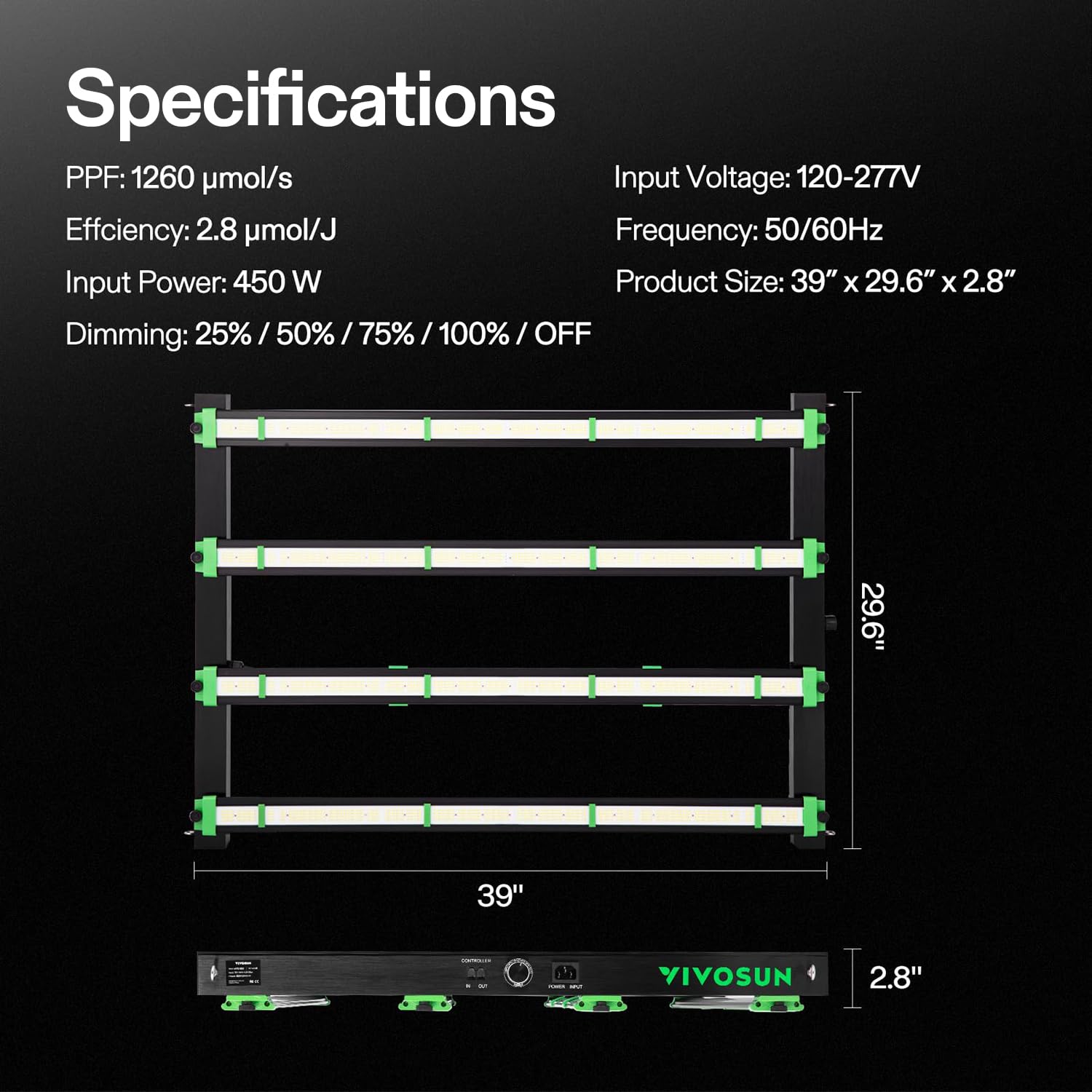 High Efficiency and Uniformity: This grow light has a 40% higher PPFD than comparable HID lights and a higher conversion efficiency (2.8μmol/J); Uniform and dense PAR map means deeper light penetration for healthier plants all while consuming only 450W, for max efficiency
