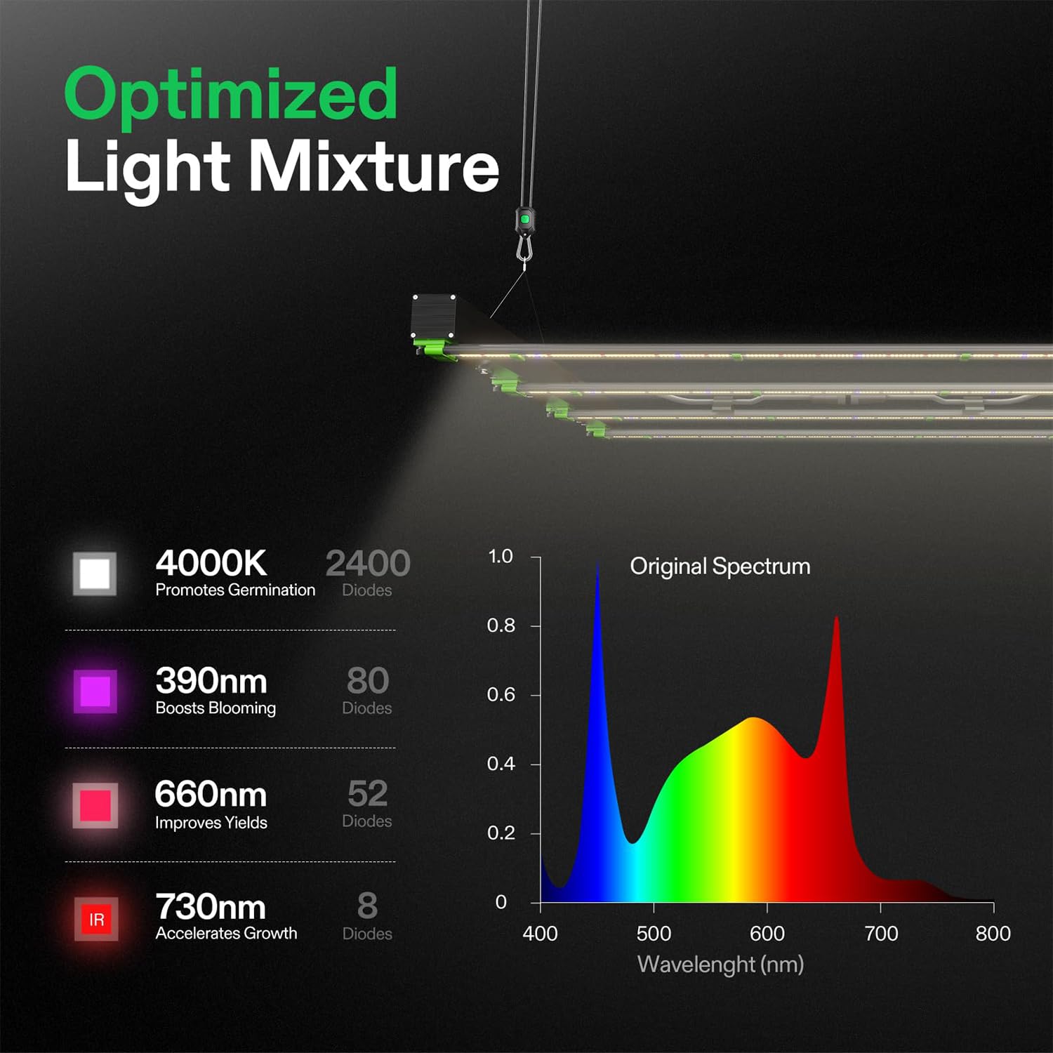 Full Spectrum with UV/IR: Full spectrum coverage from 380-780nm, including 450nm, 660nm, 730nm and rich photosynthetic UVA; great for all stages of plant growth; warm white light promotes flowering; blue light promotes germination, and red for greater potency