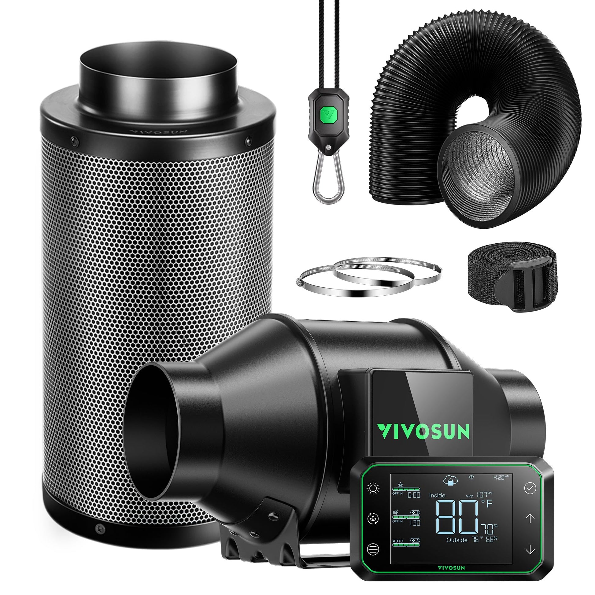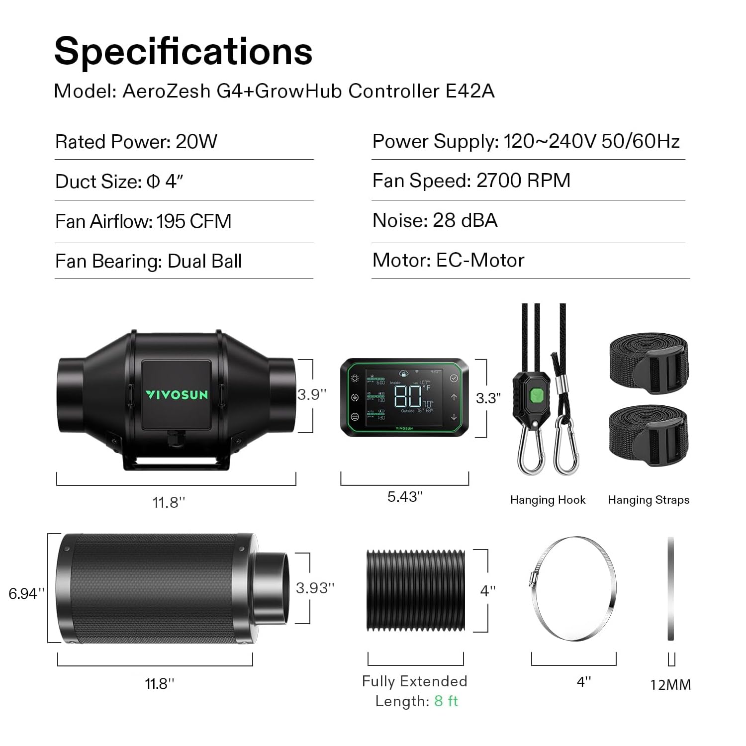 Perfect Smart Combination: Includes AeroZesh G4 4” Inline Duct Fan, GrowHub E42A Controller, 4” Black Carbon Filter, and φ4” 8' Black Ducting; Ideal for moving and transporting air in various air circulation and ventilation projects; The GrowHub E42A controller allows for precise and easy control over the fan speed, airflow, and many other elements, stabilizing and optimizing your growth environment