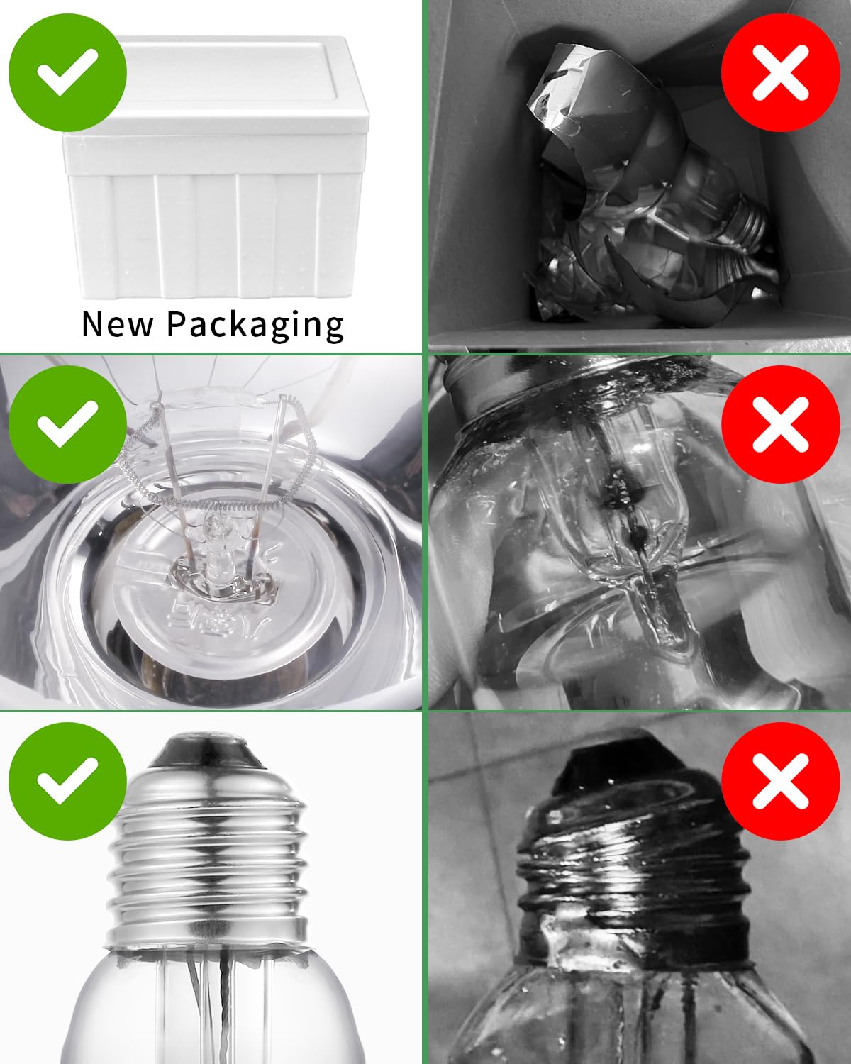Safety Tip: Featuring a standard E26 base (1.02''), this incandescent light bulb is easy to install and compatible with most fixtures. For safe operation, maintain a safe distance, avoid contact with hot surfaces, and ensure the bulb is not exposed to water or unstable voltage.