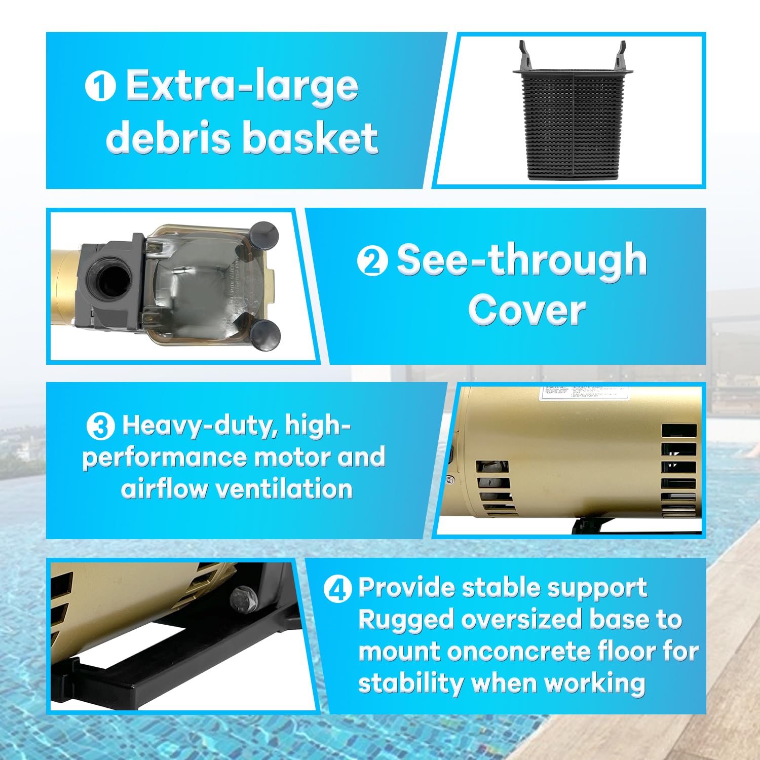 [๐๐ฌ๐๐ซ-๐ ๐ซ๐ข๐๐ง๐๐ฅ๐ฒ ๐๐๐ฌ๐ข๐ ๐ง] The 115/230V 2HP Single-Speed Pool Pump with corrosion-resistant stainless steel housing, and durable plastic components built for long-lasting performance in challenging conditions. The transparent strainer cover allows for quick and easy monitoring, making cleaning more efficient and convenient