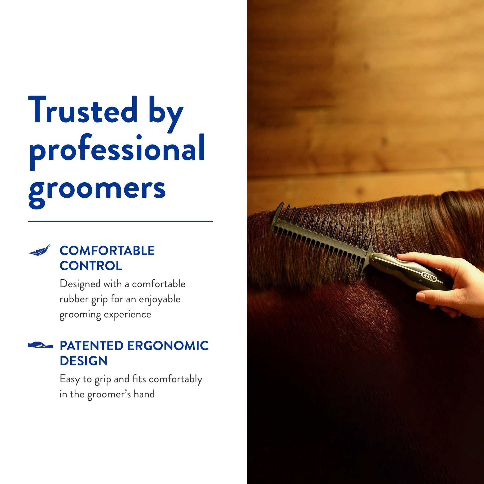 Horse Grooming Tool: Wahl's Mane Braiding Comb, designed for utmost comfort and usability, features a soft, patented ergonomic rubber grip for easy handling