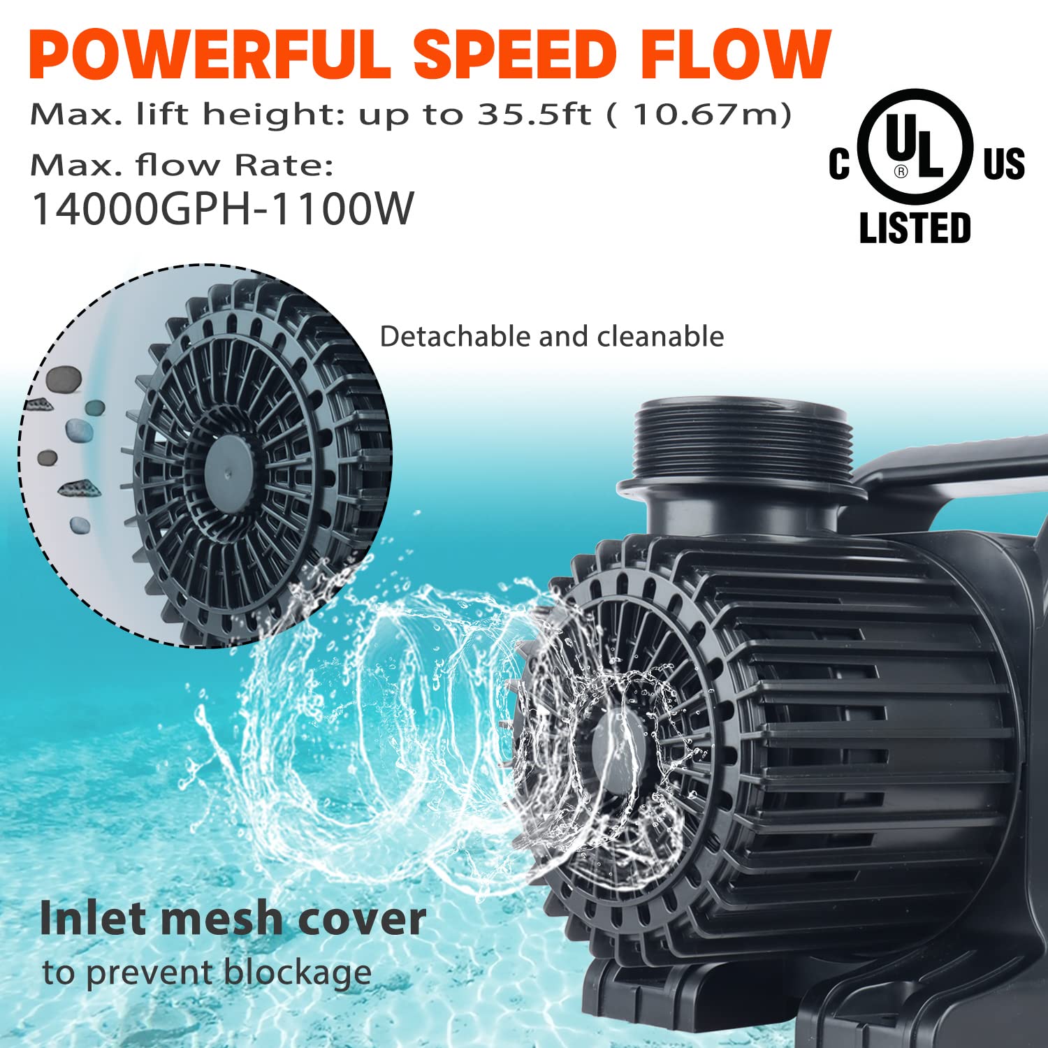 ULTRA QUIET & OVER-HEAT PROTECTION – Our pond pump is designed to be nearly silent. It features a unique inlet mesh cover that prevents garbage suction as well and reduces motor sounds, ensuring your water bodies are quietly circulated and maintained. Engineered for 24-hour continuous use, while a heat-overload sensor prevents a burnout.