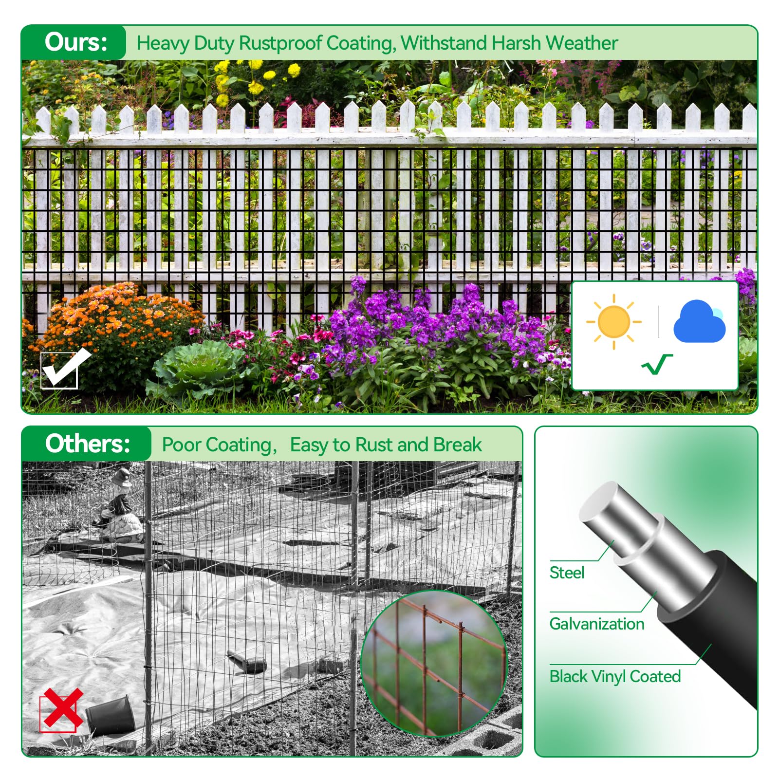 【PERFECT FOR OUTDOOR USE】- This welded wire fence is made of high-quality metal wire mesh, coated with black vinyl on the surface. It is resistant to rust and can withstand harsh weather conditions. Its sturdy and flexible design ensures long-term protection for animals and plants, and reduces maintenance costs