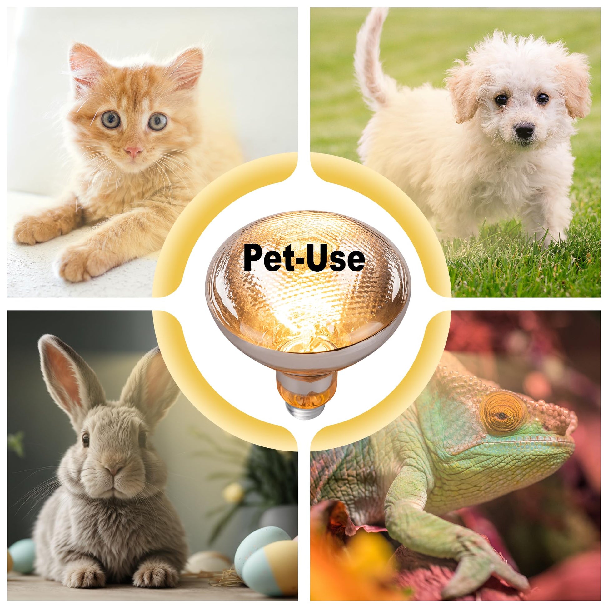• Agricultural Use: The PAR38 250W heat lamp bulb is ideal for breeding and rearing of chickens, chicks, pigs, poultry, calves, foals, dogs, and other animals. It provides the necessary warmth to create a comfortable and healthy environment, supporting the growth and well-being of your livestock and pets