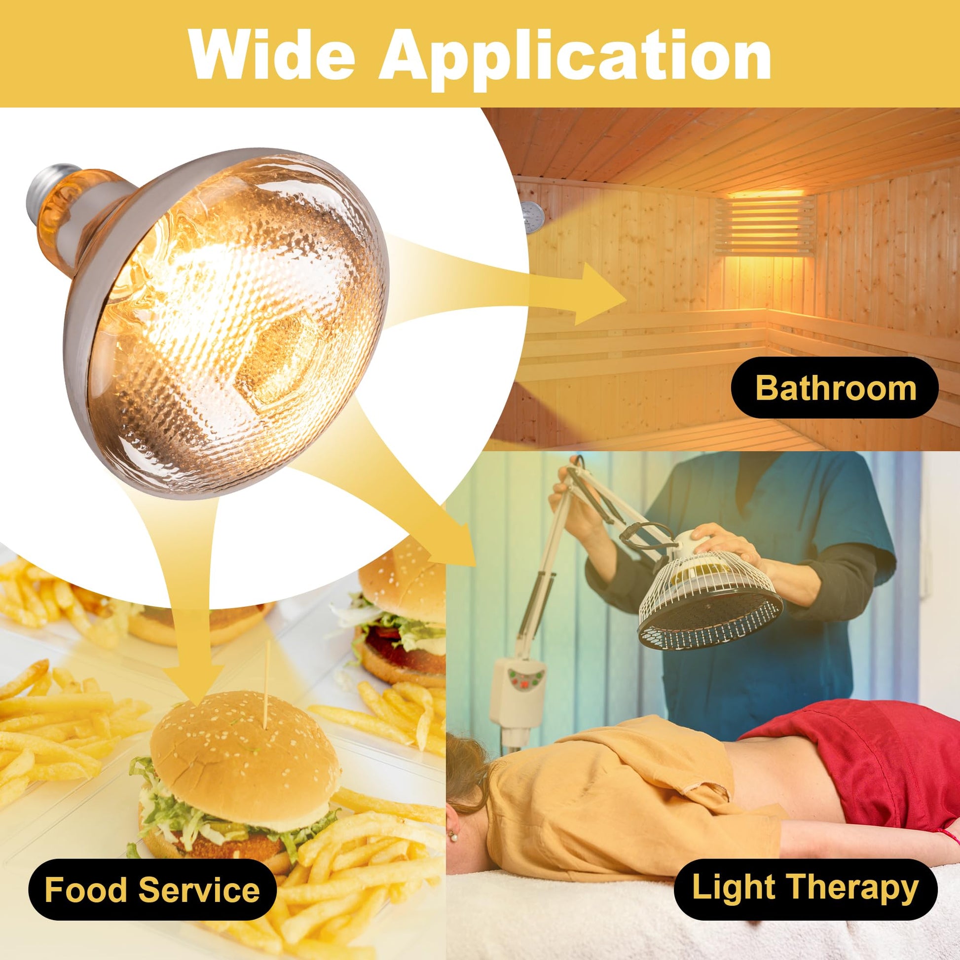 250W Heat Lamp Bulbs: Ideal for recessed light fixtures in bathrooms, these high-efficiency bulbs provide instant warmth, keeping your bathroom cozy and comfortable after showers. Enjoy a spa-like experience with the reliable and consistent heat provided by these durable bulbs