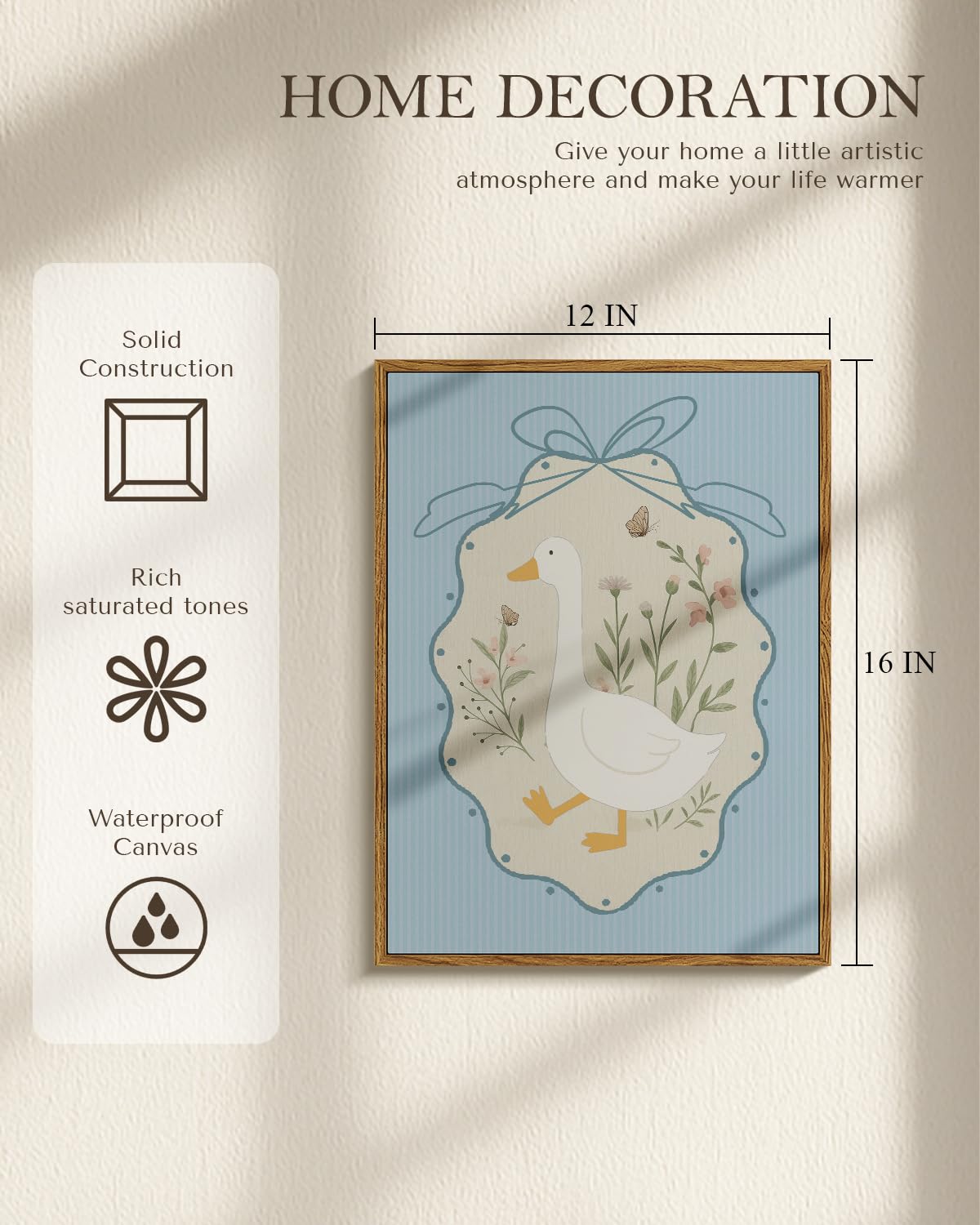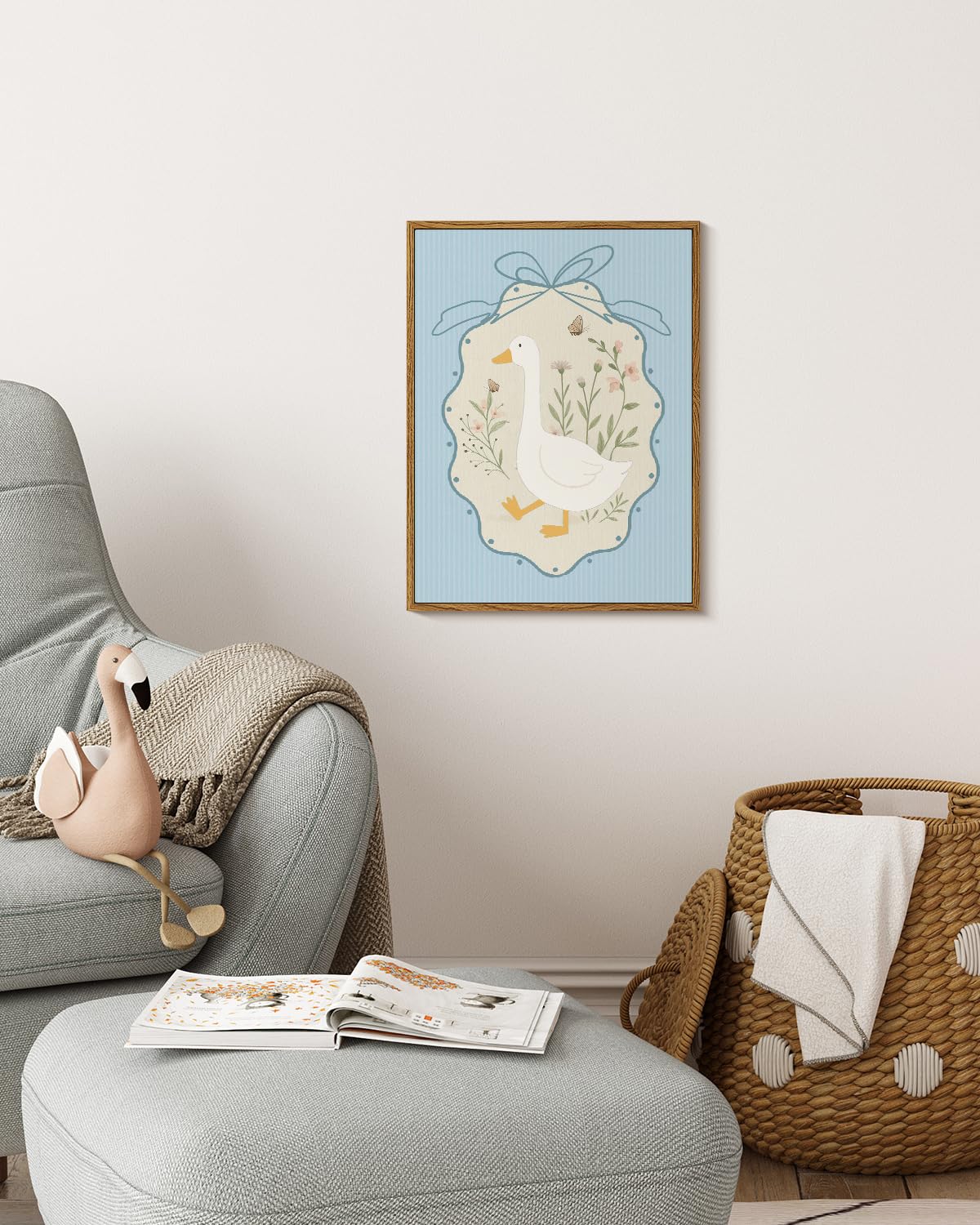 Charming Goose Illustration: This framed canvas print showcases a delightful goose surrounded by soft floral details and butterflies. Its playful yet elegant design adds a welcoming, nature-inspired touch, making it ideal for nurseries, kids’ rooms, or farmhouse-style interiors.