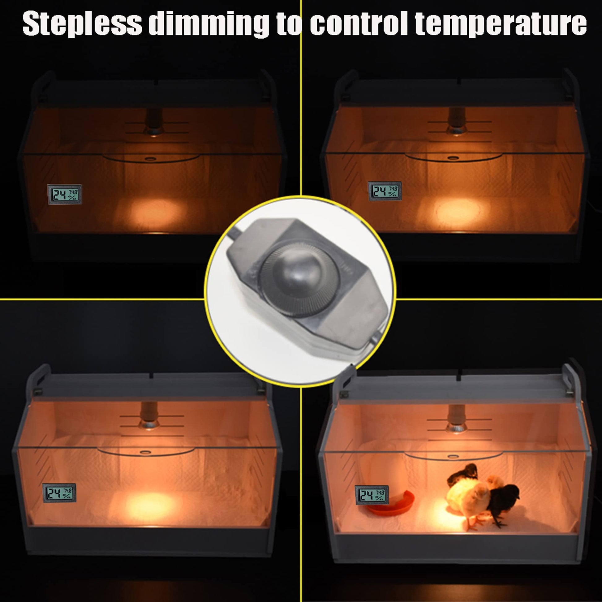 110V/50W Heating Lamp: Quickly preheat the breeding box within 3s, adjust the brightness of the light bulb through a stepless knob, and control the temperature of the breeding box between 0 and 120 ˚ F。 Warm as summer sunshine (requires assembly of 15.75x11.81x1.81 inches).