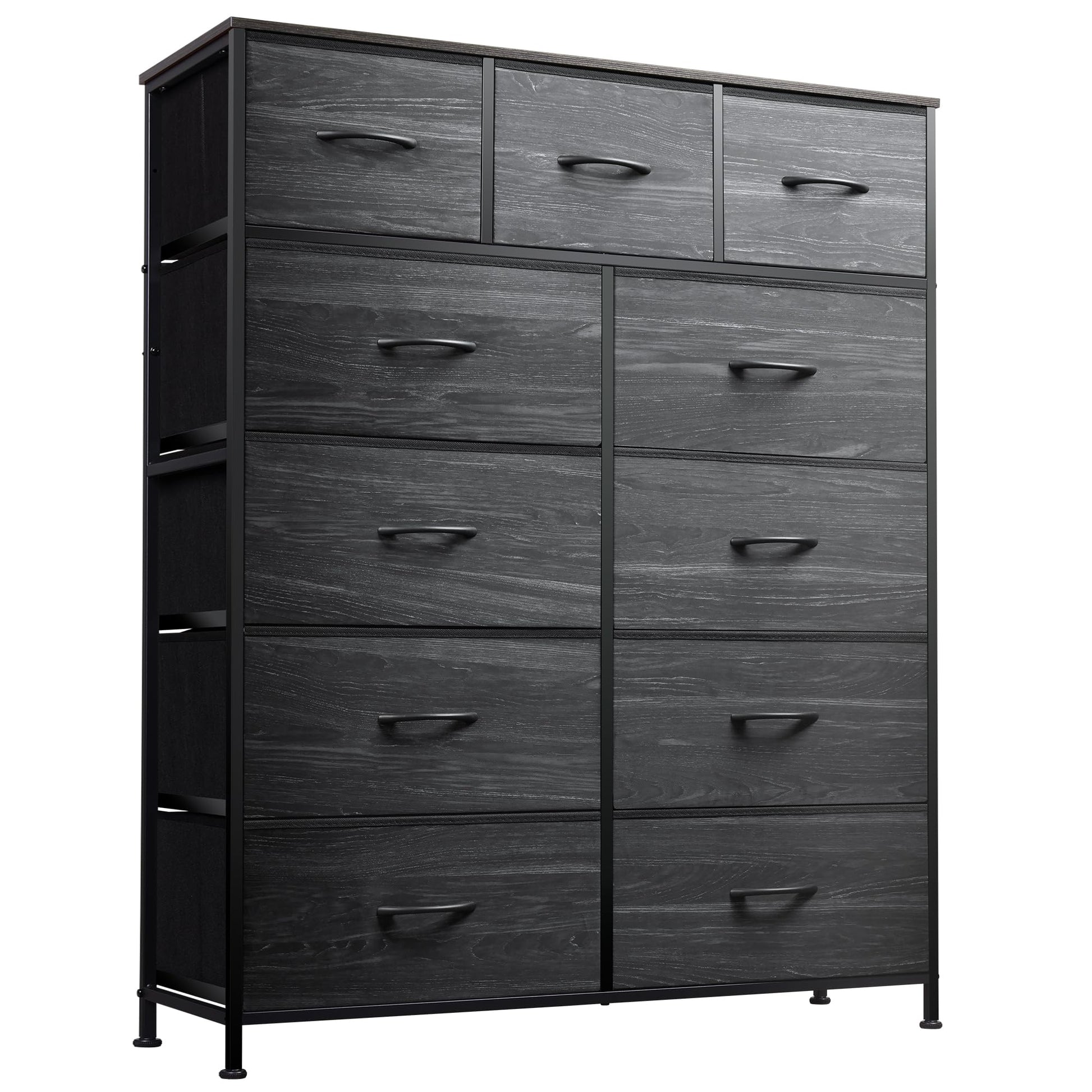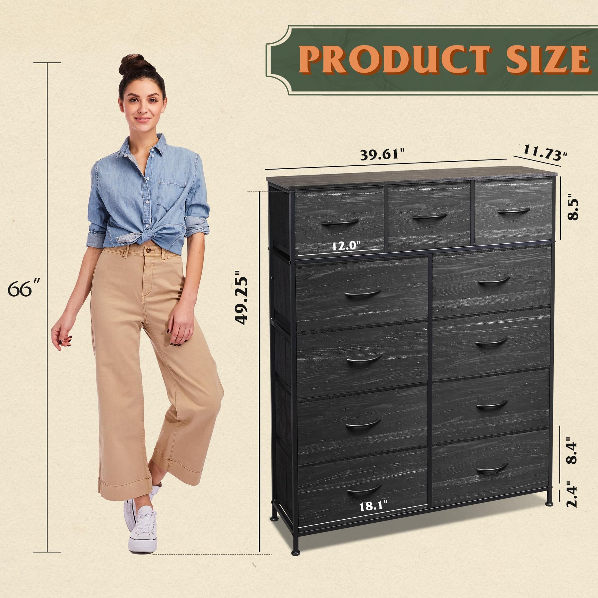 WLIVE Storage Organizer Unit with 11 Fabric Bins, Storage Drawers Organizer with Steel Frame, Tall Storage Tower Organizaton for Living Room, Hallway, Office, Charcoal Black Wood Grain Print