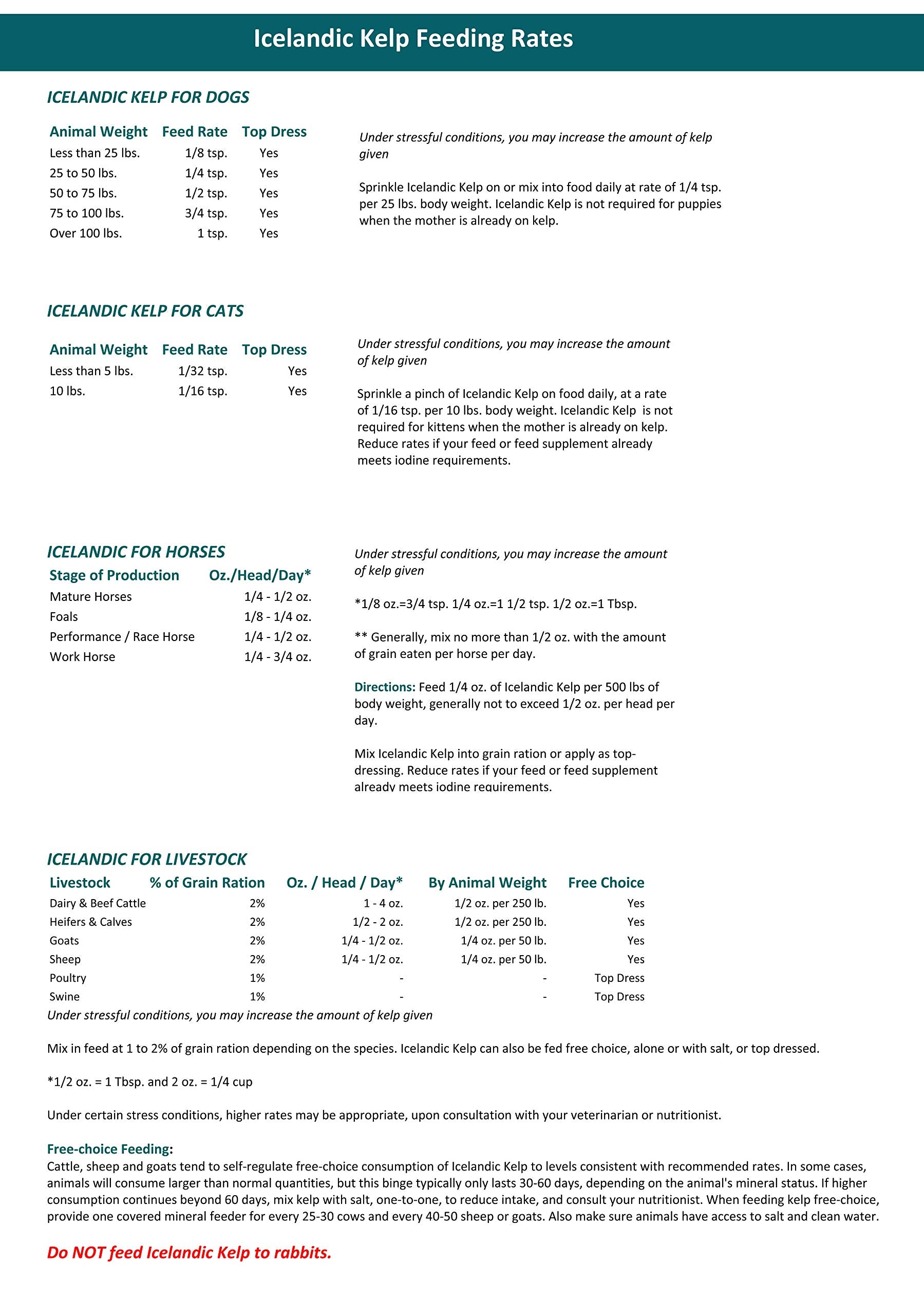 Wolf Creek Ranch Icelandic kelp provides health benefits for pets & livestock. Icelandic kelp can be fed daily to your dog, cat, goat, chickens & livestock. Excellent for all life-stages. Icelandic kelp contains over 60 minerals (calcium, magnesium, nitrogen, phosphorus, potassium, sodium, sulfur, cobalt, copper, iodine, iron, maganese, selenium, etc.); 17 amino acids, including lysine, hystidine, and proline; vitamins A, B1, B6 (Niacin), B12, D, E, and K.