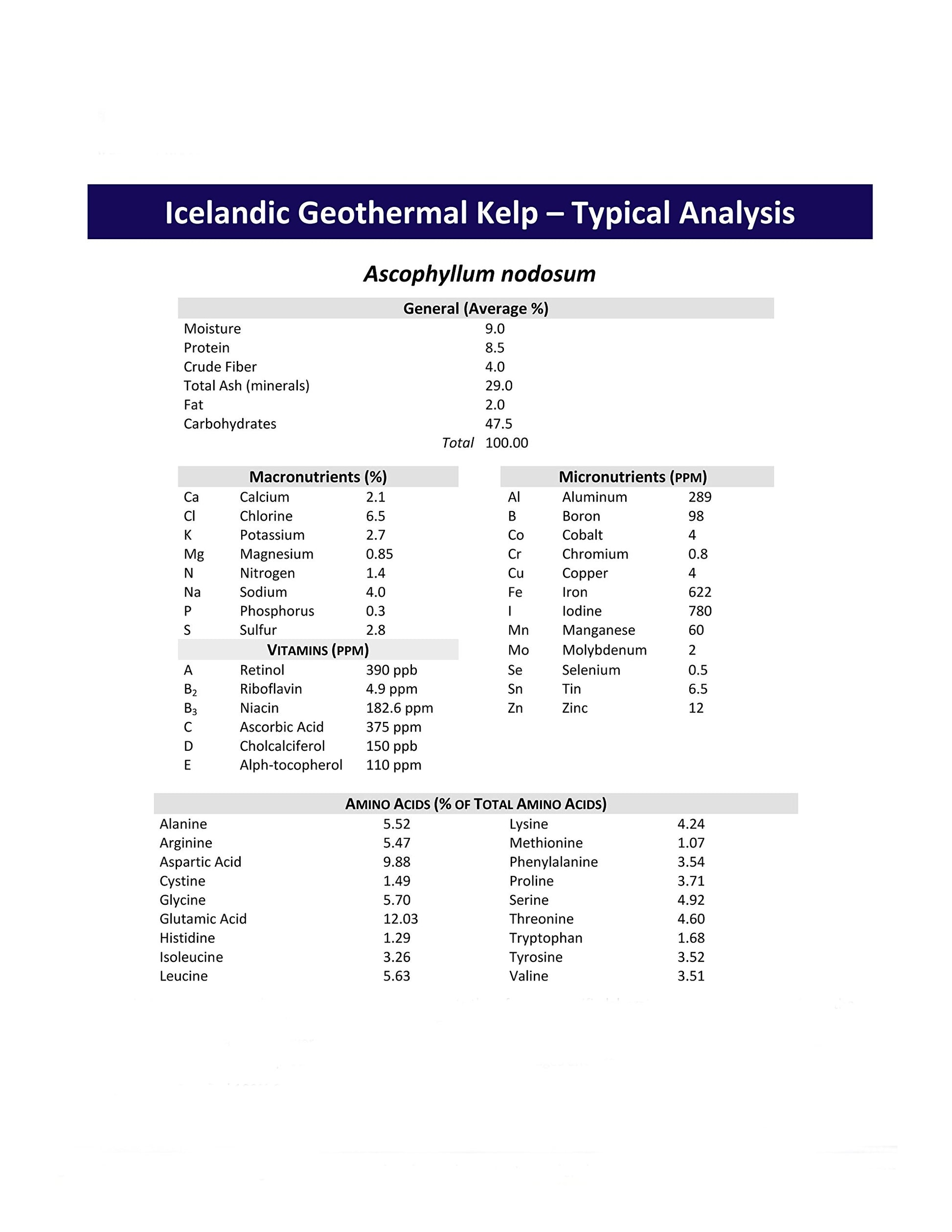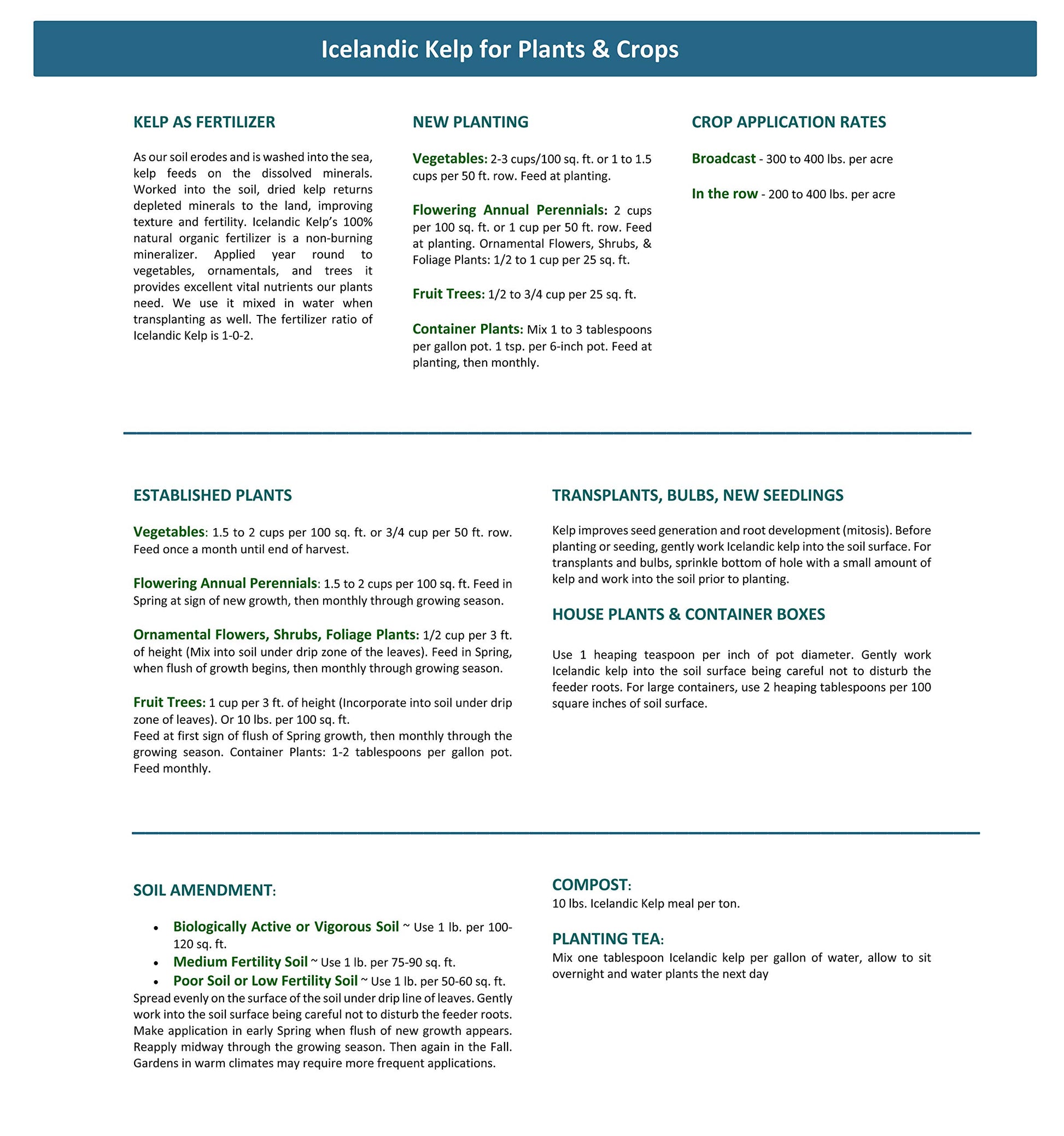 Wolf Creek Ranch Icelandic Kelp is also beneficial for your garden. Use for orchid food or to supercharge your lawn this is a one stop kelp fertilizer. In addition to the minerals and vitamins, Icelandic kelp provides plant growth hormones - auxins, cytokinins, and gibberellins.