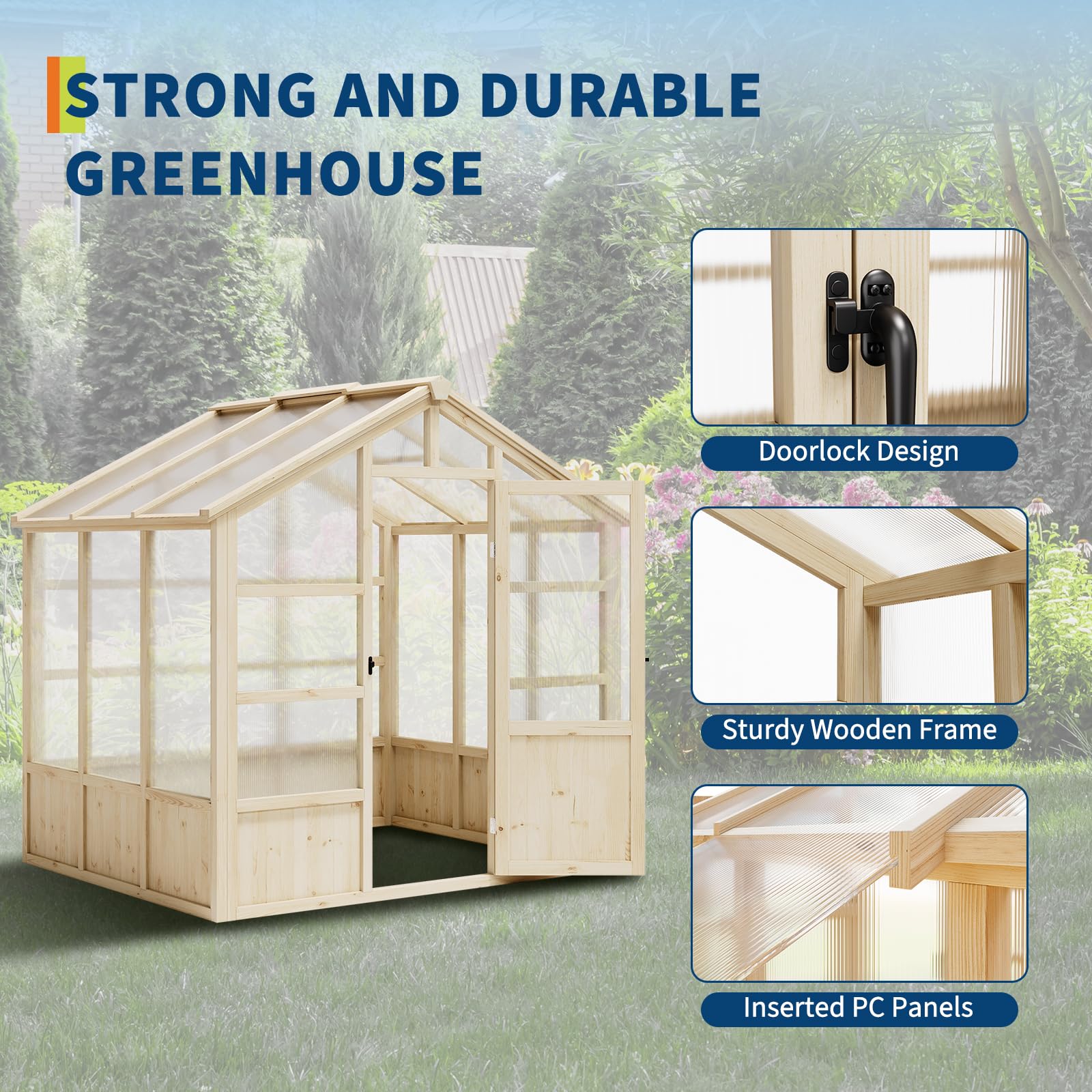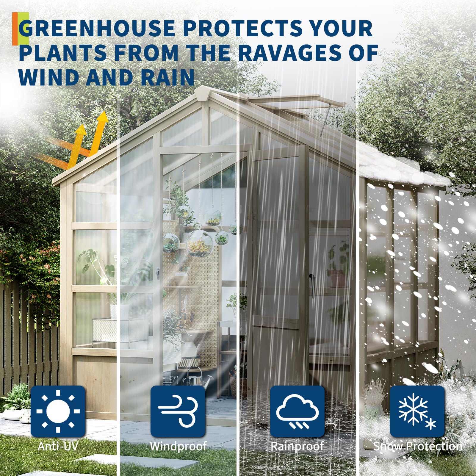 Sturdy Cedar Frame - Cedar wood is a strong material, which can be well protected . This sturdy construction requires minimal wind anchors, blending seamlessly into your backyard with a timeless aesthetic. When wood is heated by the sun during the day, it will keep this heat at night, which will be beneficial to your energy consumption in the greenhouses, especially in winter.