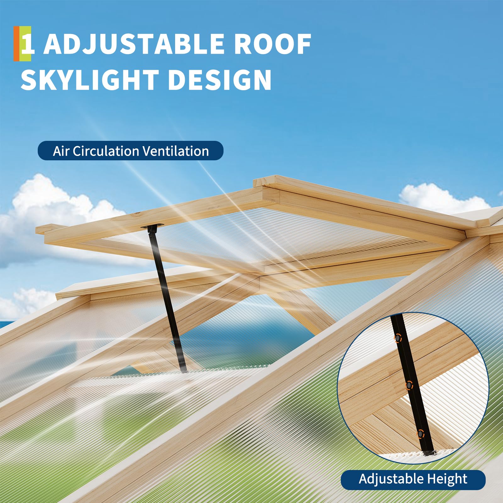 Adjustable Ventilation Window - Provides fresh air to your plants via the window with adjustable opening angle. The bolts on the greenhouse frame kit sides could be used to fix the roofs and keep them open to provide a ventilation system and balanced temperature for your plants in different seasons.