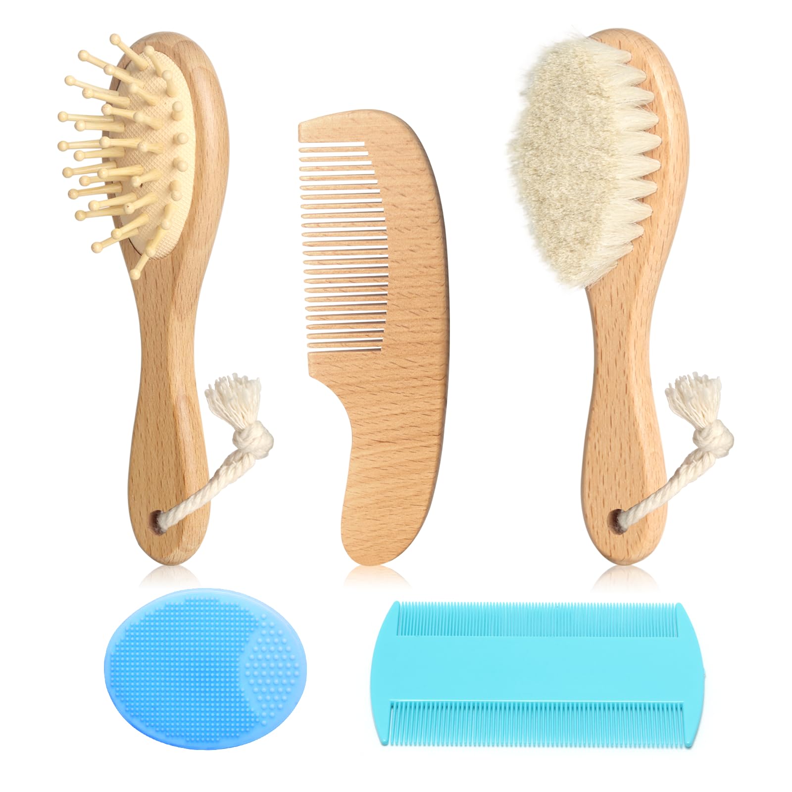 Wooden Natural Goat Bristle Brush and Cradle Cap Comb Set - 5 in 1 Baby Grooming Kit for Newborns, Toddlers, Boys, and Girls (Blue)