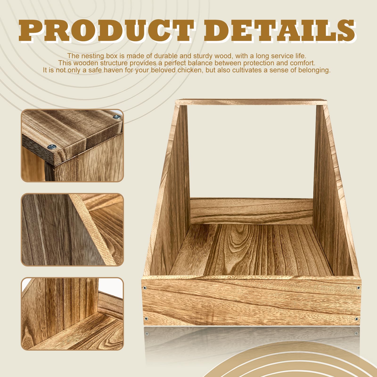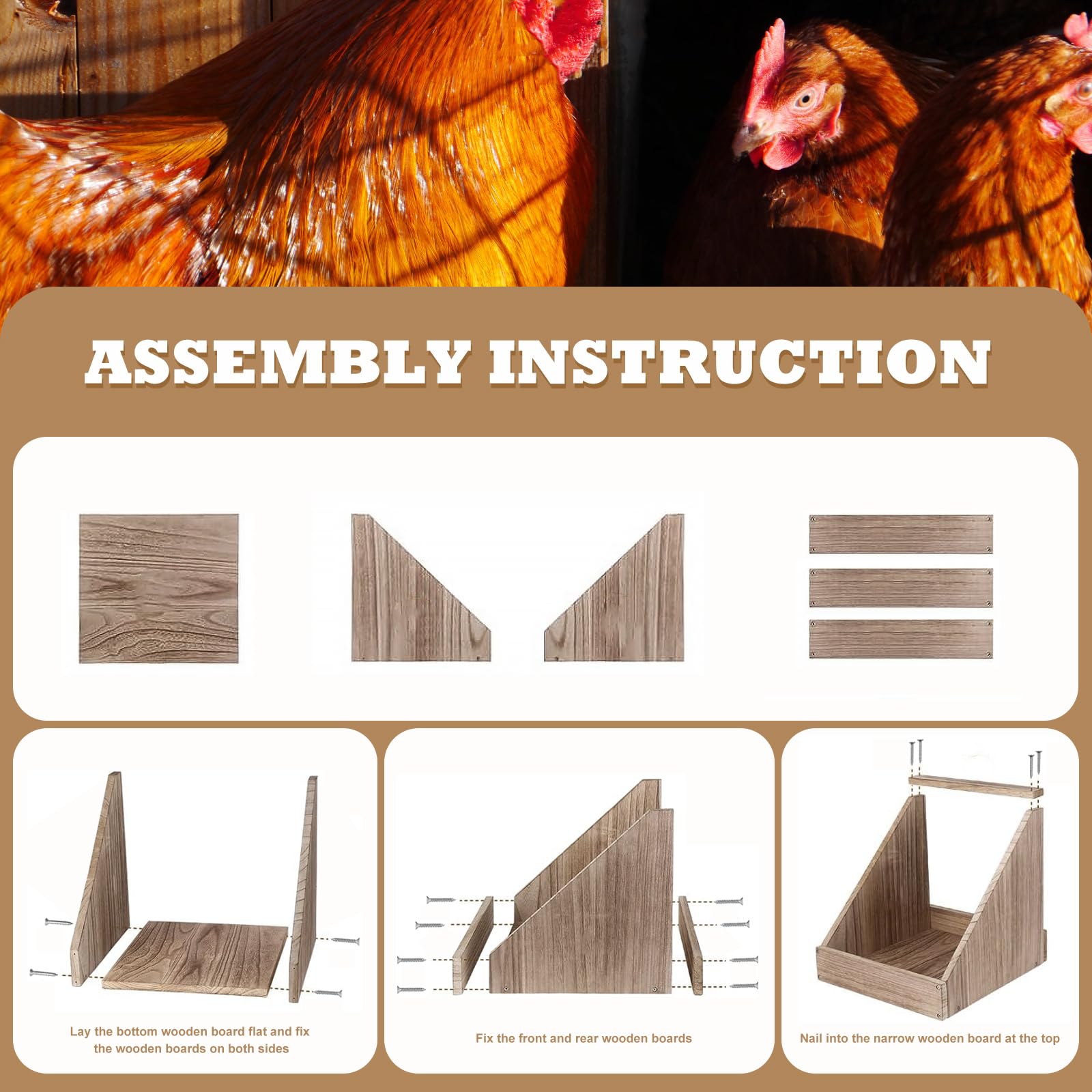 Quality materials: Made from high-quality wood, our chicken coop nesting boxes are built to withstand the elements and last for years. The wooden panels have pre-drilled screw holes for quick installation