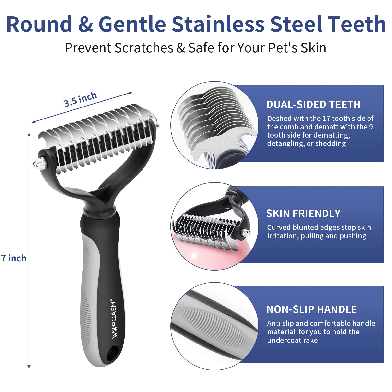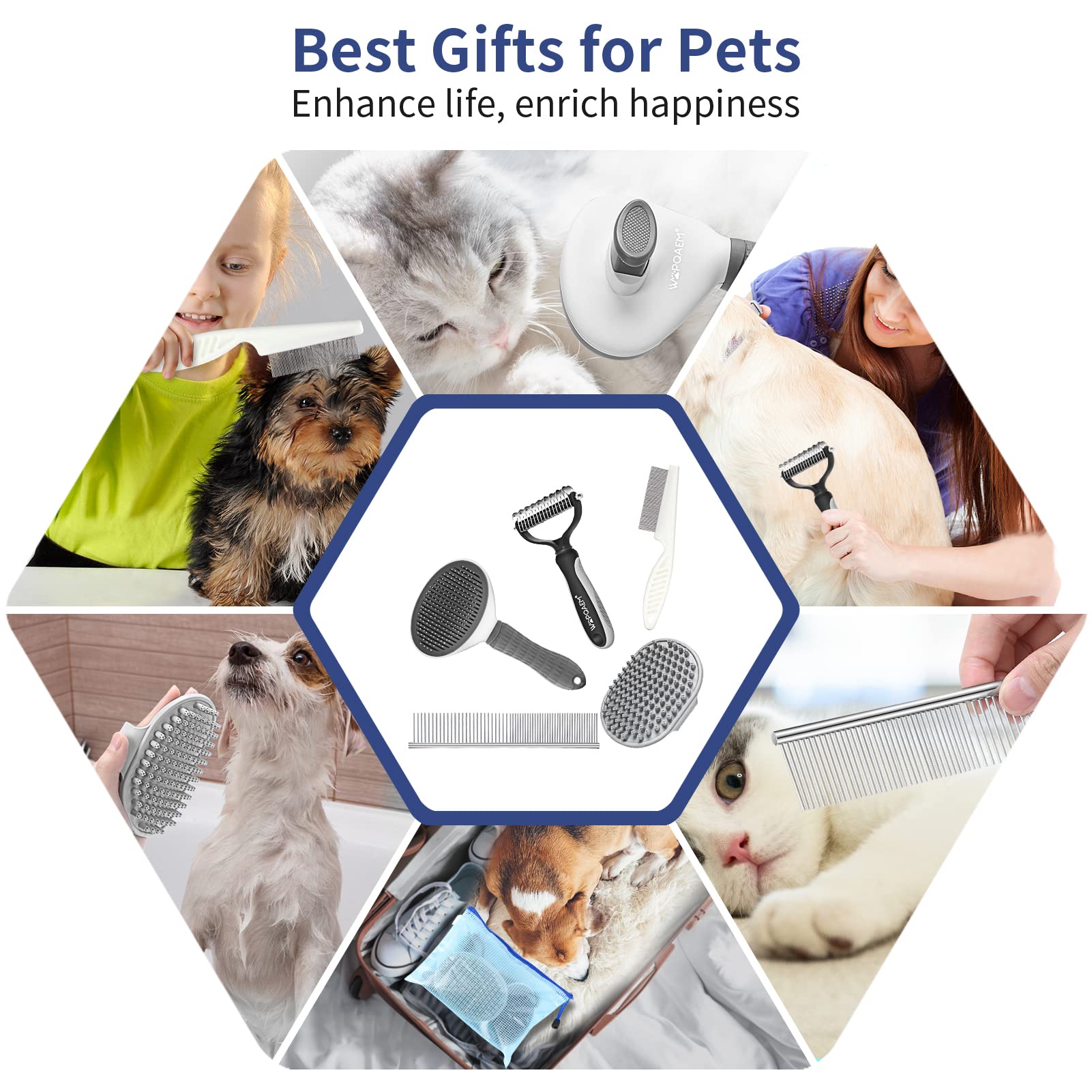 WOPQAEM 5 in 1 Dog Grooming Kit - Self-Cleaning Slicker Brush for Shedding Short Long Haired Dogs & Cats, Includes Pet Comb, Flea Comb, Bath Brush, Undercoat Rake - Complete Fur Care Set - Gray
