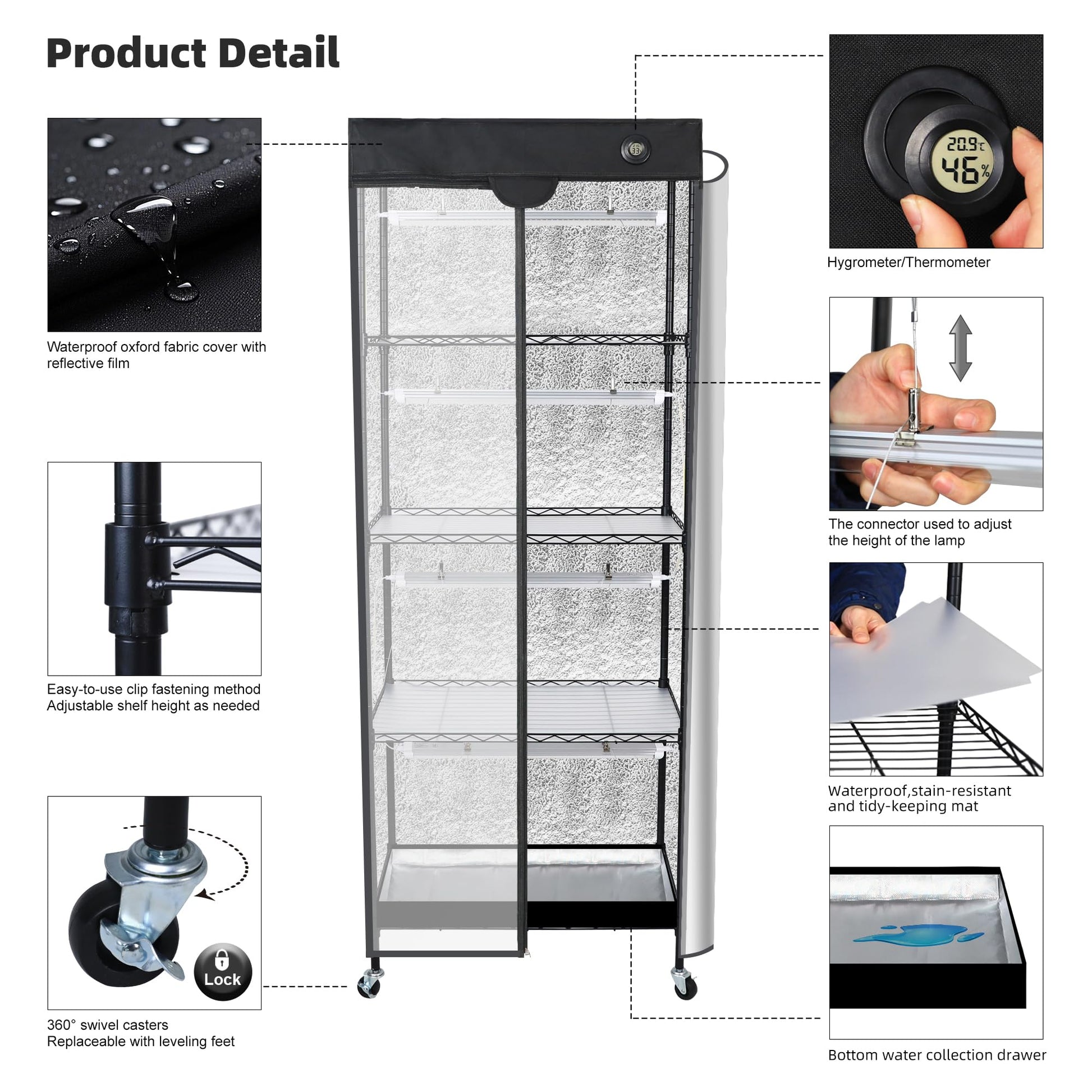 Integrated LED Grow Lights & Digital Thermo-Hygrometer – Equipped with 4x T8 grow lights, this mini greenhouse ensures optimal plant growth indoors by providing a balanced light spectrum for photosynthesis. The built-in digital temperature and humidity monitor allows you to track the growing environment accurately.