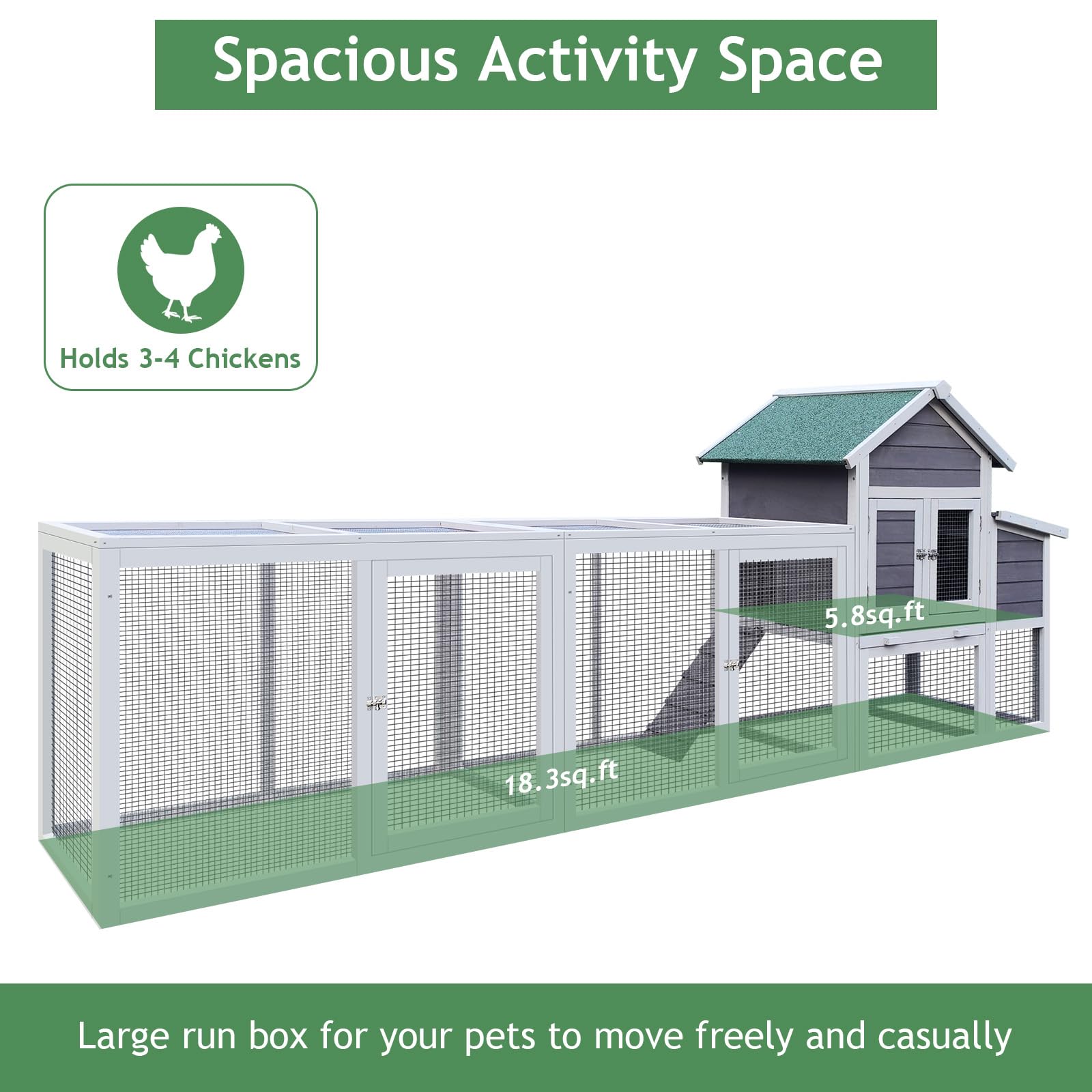 【Spacious Area for Happy Hens】This large chicken coop (122"L x 22"W x 44.5"H) comfortably houses 2-4 chickens. The elevated main house gets nesting box for laying eggs and built-in perches for roosting. The roomy enclosed run allows chickens, ducks, rabbits or other small pets to move freely.