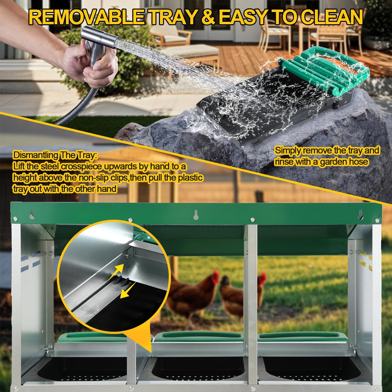 【STURDY AND DURABILITY】Our chicken coop nesting box is made of galvanized steel creating a durability and stable structure when assembled and ventilation holes for fresh air flow. The egg laying area is made of plastic, which is easy to clean and not easy to rust.