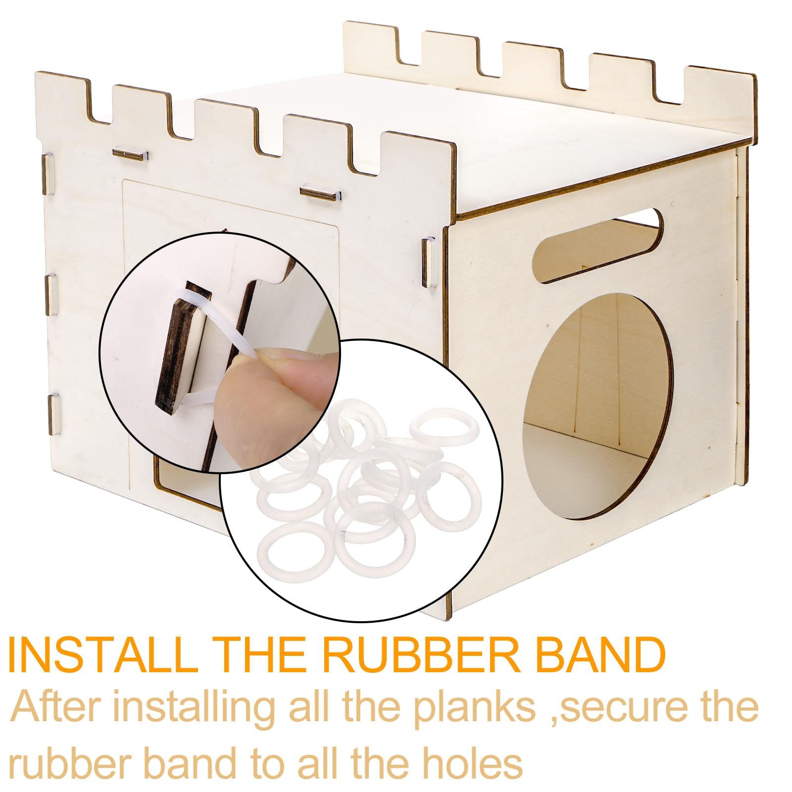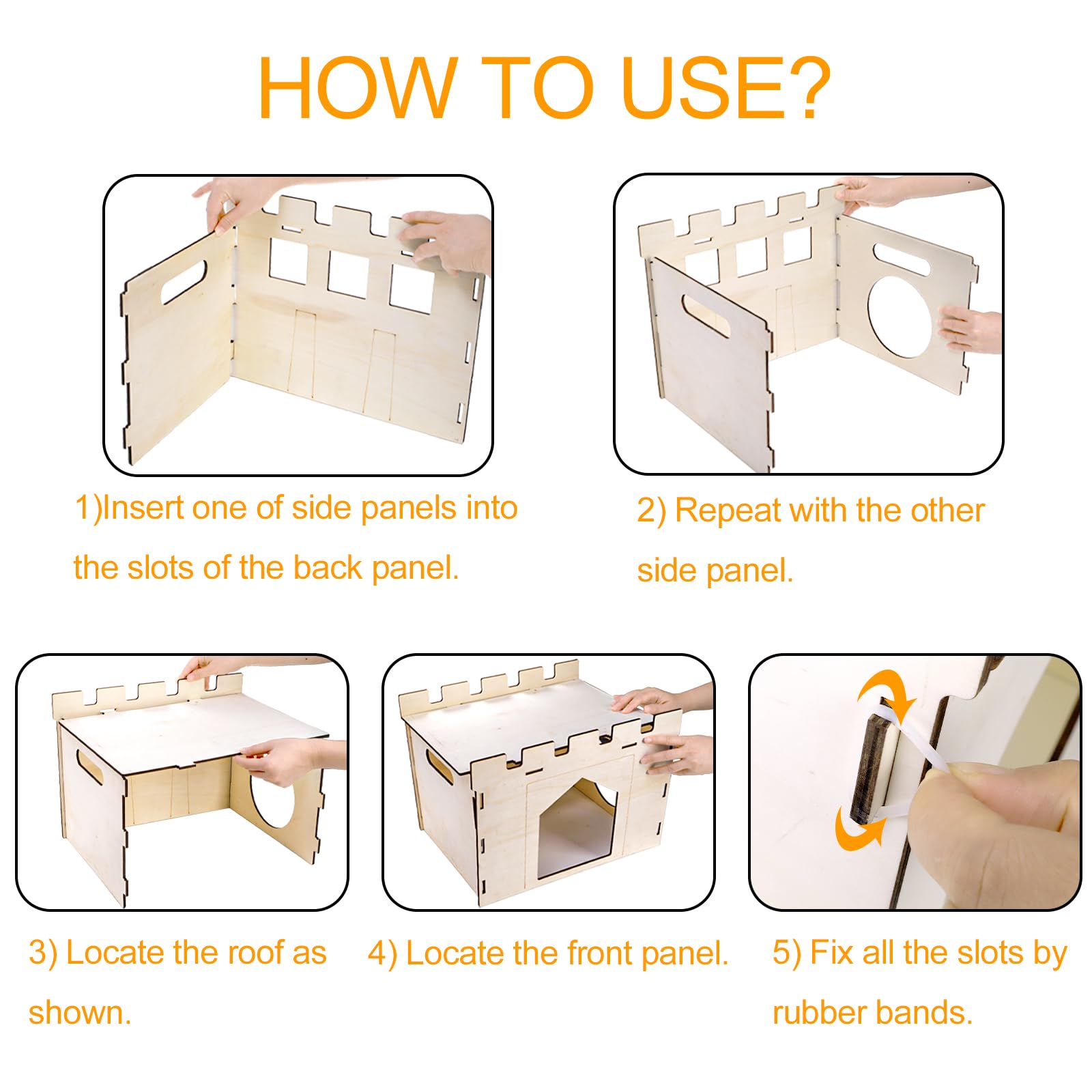 This rabbit hiding house is easily assembled to put 5 panels together with rubber bands. Also the convenient side panel handles make it movable and portable, detachable for easy storage.