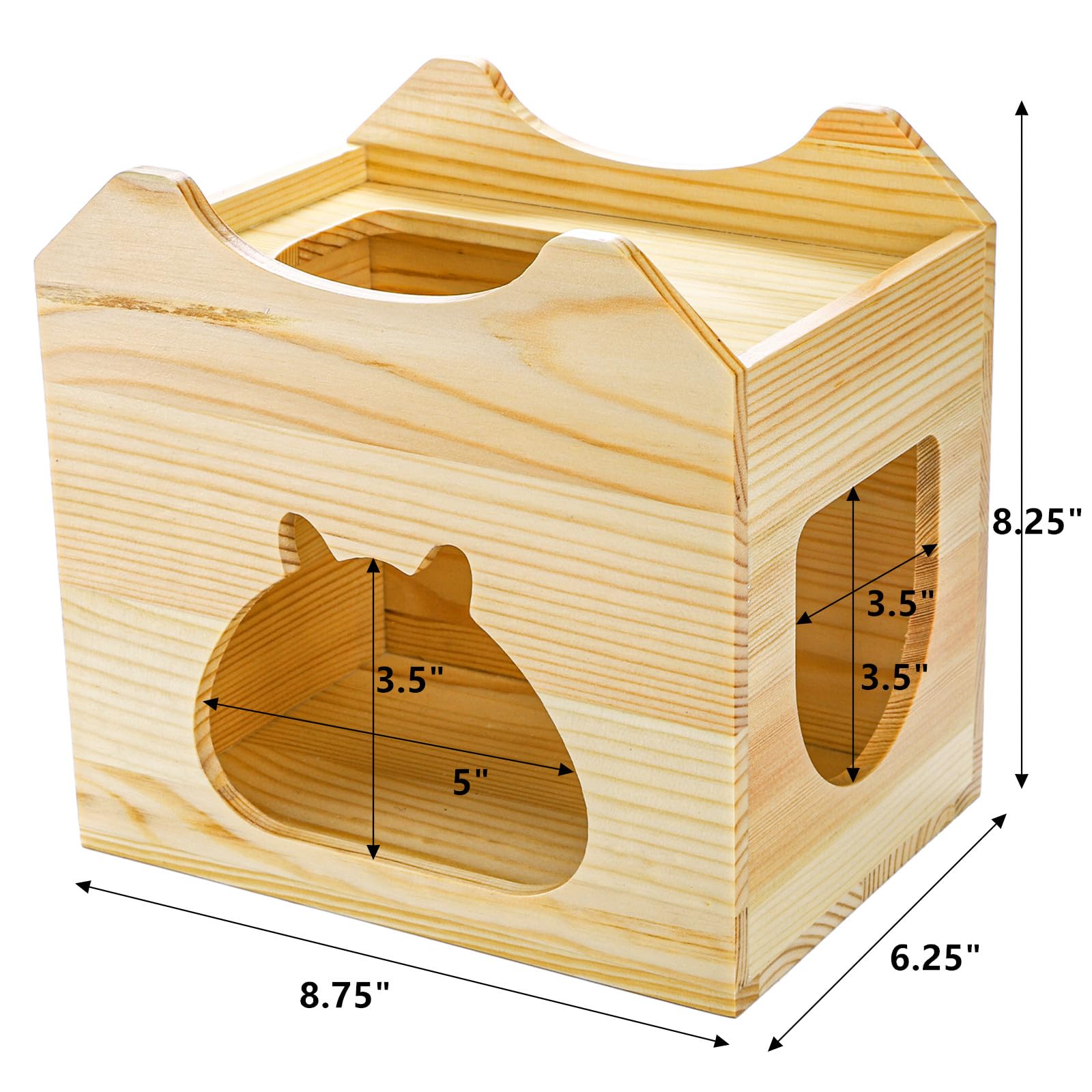 Multiple ventilated entry and exit holes. Large entrance promotes exploration, various openings providing small pets with easy access to a well-ventilated, enjoyable wooden habitat.