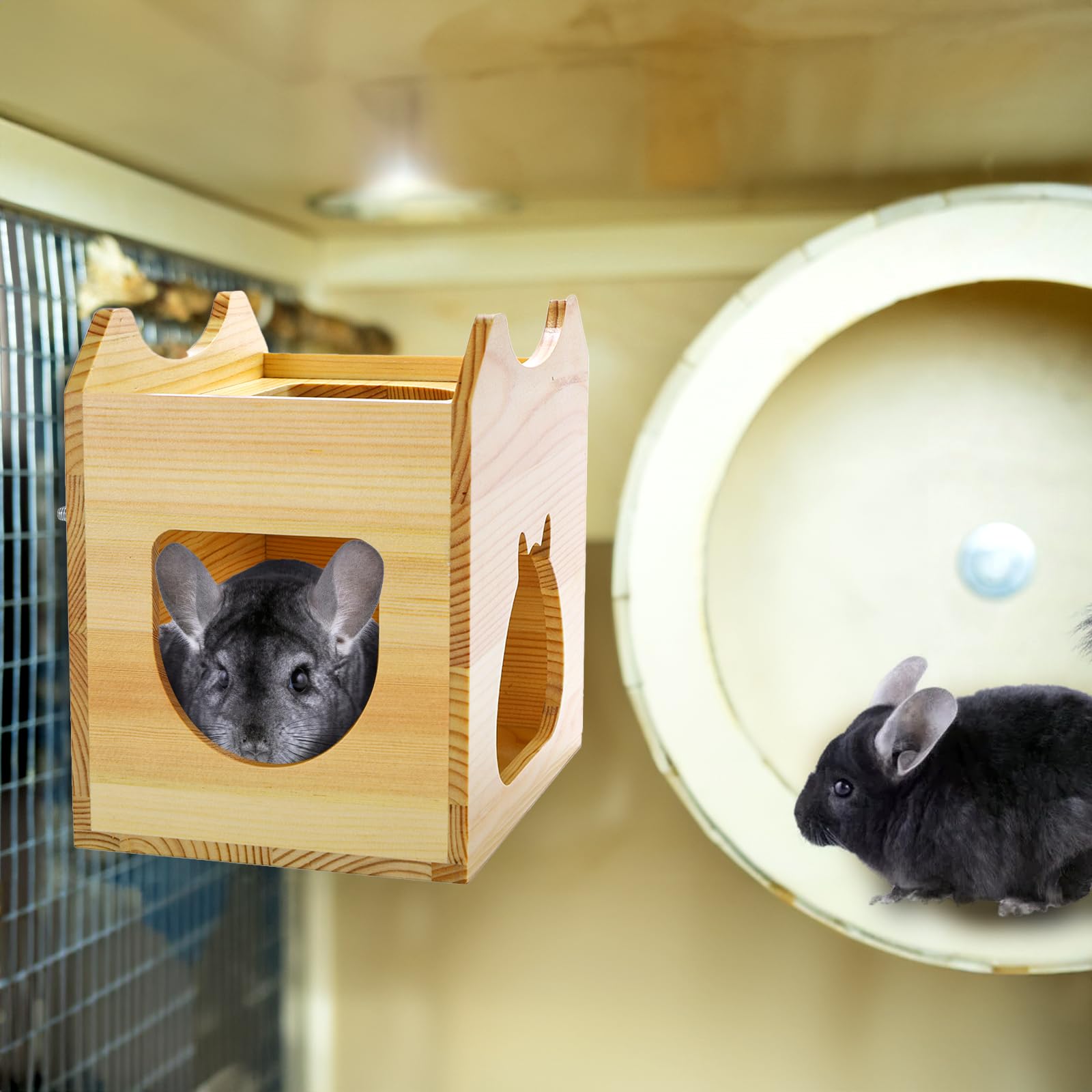Yesland Wood Chinchilla House, Natural Small Animal Hideout Hut for Chinchilla, Squirrel, Sugar Gliders in Cage -Ventilated Wooden Hamster Habitat with Multiple Doors - 8.5 X 6 X 8 Inches