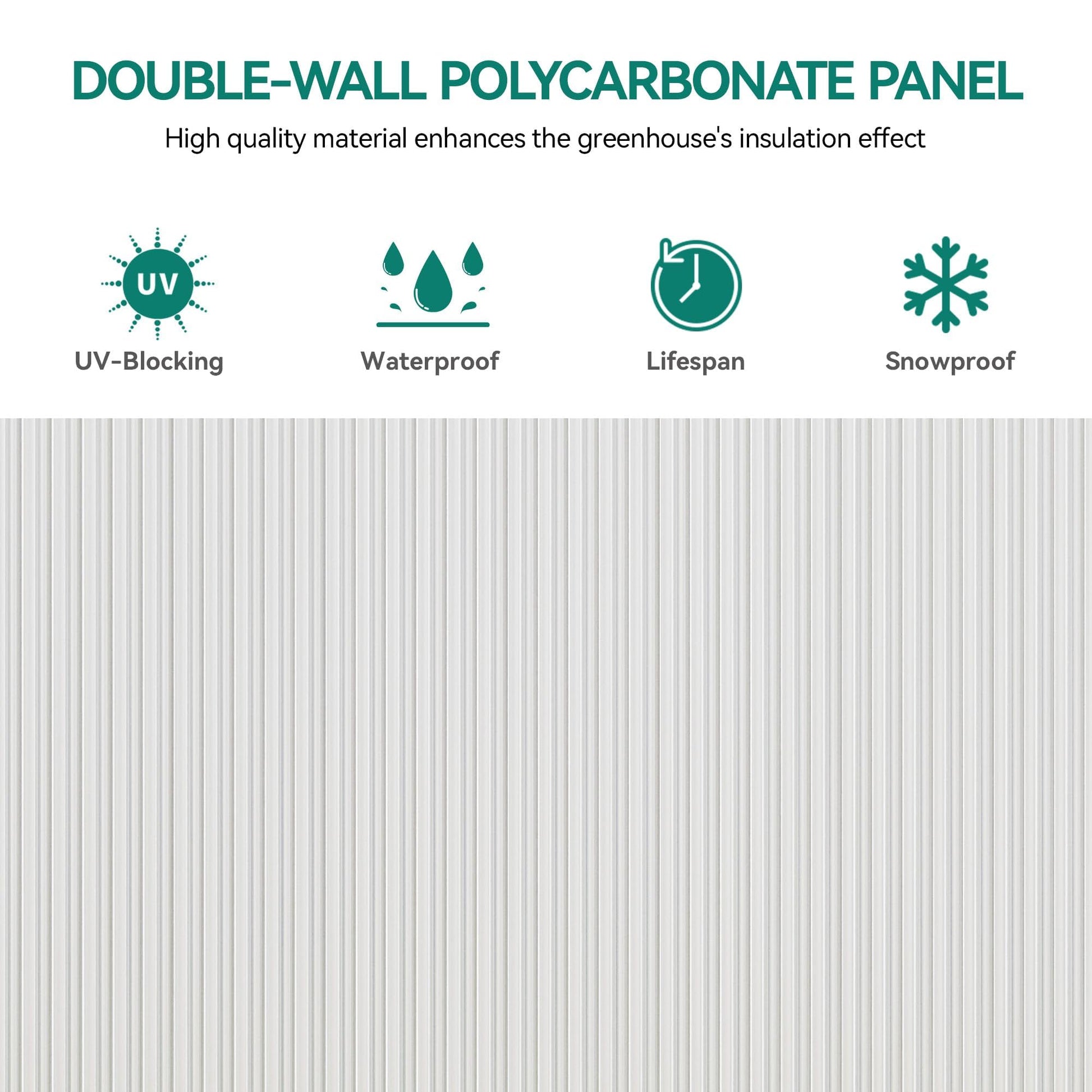UPGRADED MATERIALS - The 10x12FT polycarbonate greenhouse has a durable aluminum alloy frame, plus reinforced side rods and diagonal rod fixation to boost sturdiness and load-bearing capacity. Its 4mm double-wall polycarbonate boards with UV protection block 99% of harmful UV rays, shielding plants while maintaining good light transmission.