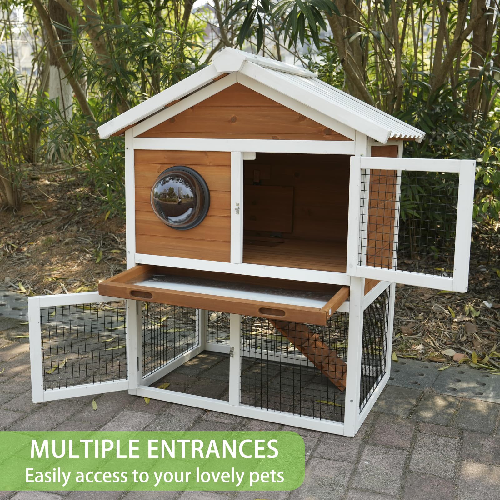 YOPTO 2-Tier Wooden Rabbit Hutch with Waterproof Roof,Outdoor Bunny Cage with Removable Pull-Out Tray,Viewing Window Design for Small Animals,Enclosure for Guinea Pigs & Hamsters,White+Red