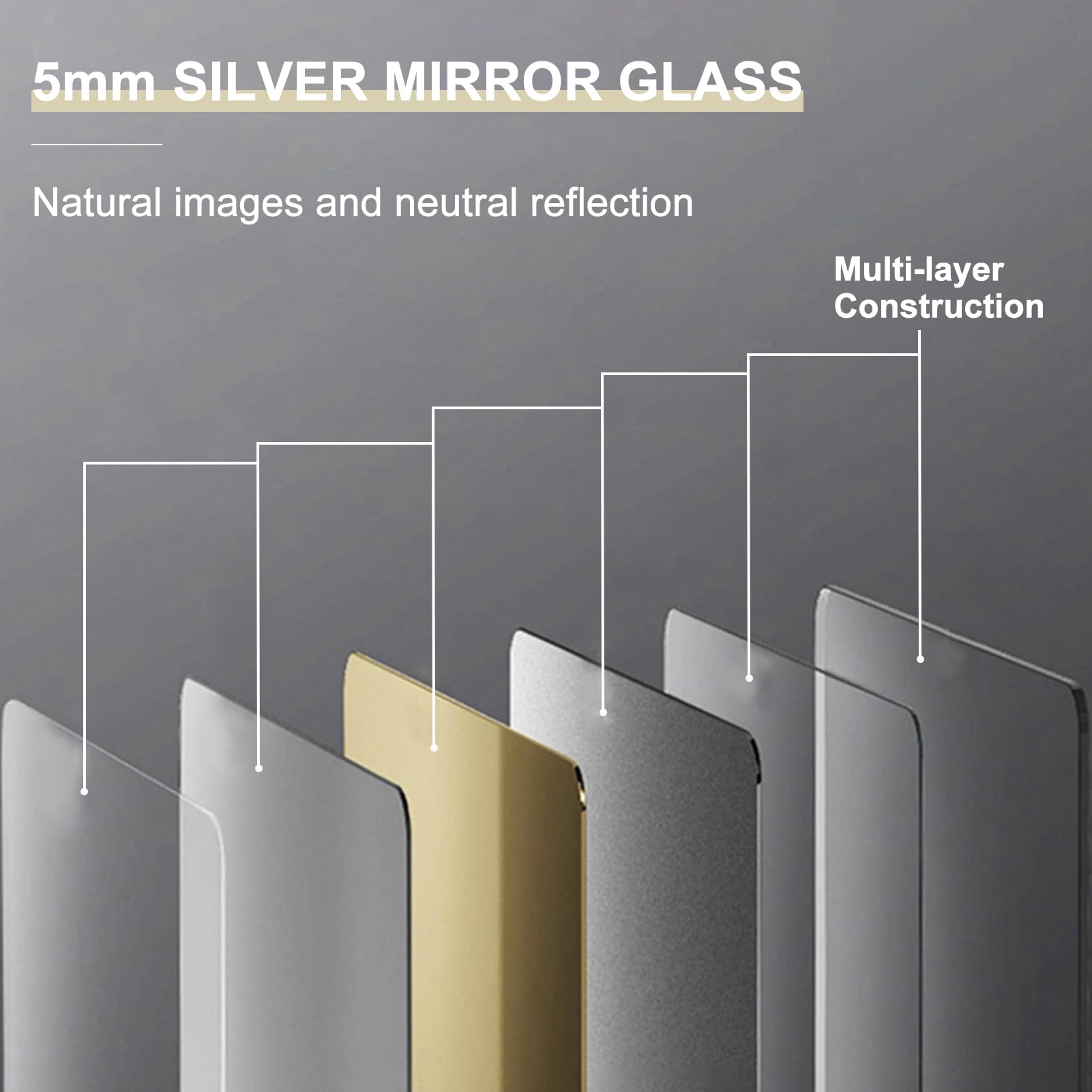 Quality Craftsmanship-- Mirror: This mirror is constructed of authentic 5mm silver backed glass which is explosion-proof and scatter prevention. Backplane: The backplane provides a double layer of protection. Premium MDF backing is well protected against moisture, perfect for bathroom.