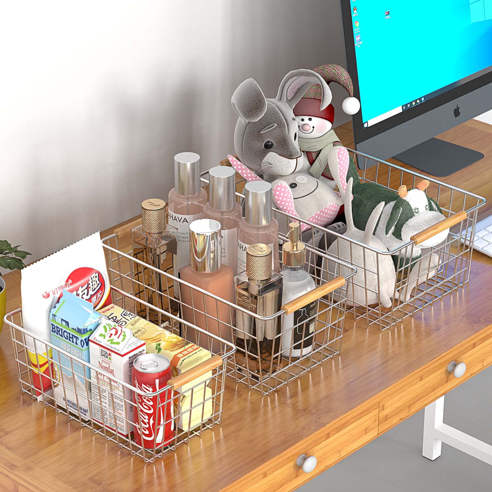 【STURDY CONSTRUCTION】:The organizer baskets are made of sturdy steel wire and rust-resistant coated, durable and last for years. The grid design ensures breathable and no odor, easy to clean.Also great for the fridge ,Open grid pattern on wire freezer bin allows for ideal air circulation.