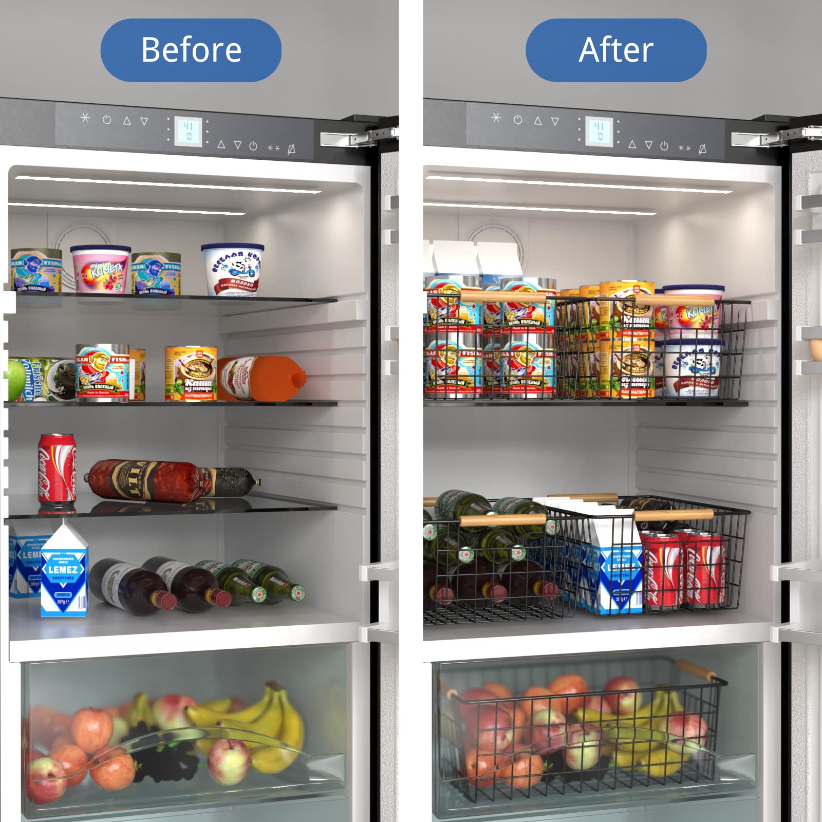 【WOODEN HANDLES】:The metal wire basket built-in rounded wooden handles for portability, Make it convenient to move and transport. It’s a ideal freezer storage basket for chest freezers, upright freezer, side by side freezer to helps freezer to be sectioned by food type.This metal storage bins are a great organize solution for your household.