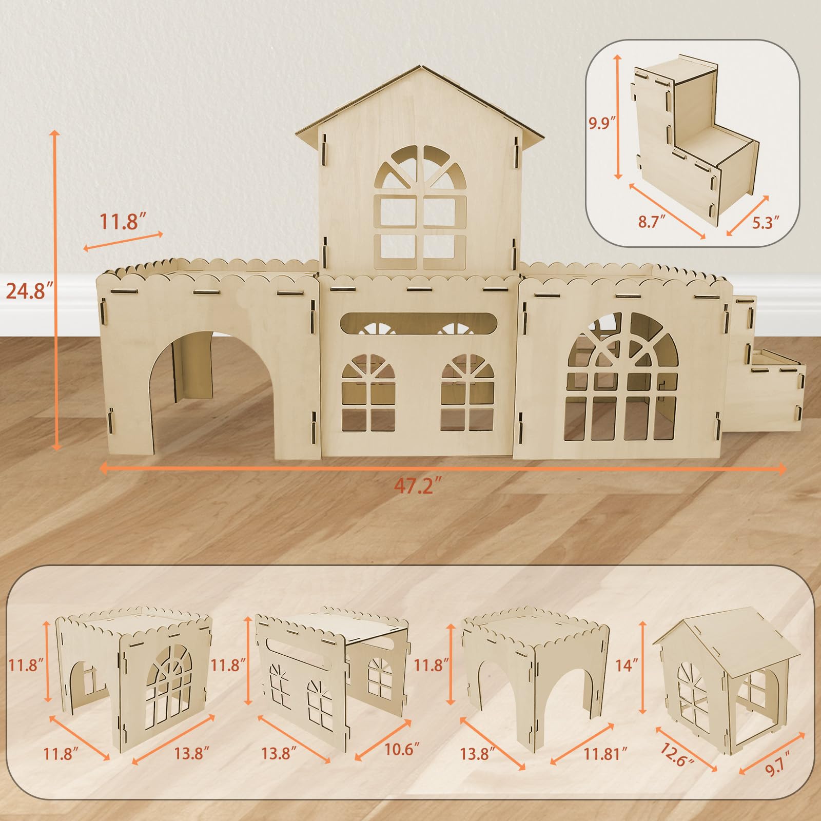 Extra large size: The overall size of this large wooden rabbit castle is 47.24 L * 11.81 W * 24.8 H; There are a total of 4 independent bunny castles: 2 flat topped wooden rabbit hideouts measuring 13.78 L * 11.81 W * 11.81 H, 1 house measuring 13.78 L * 10.63 W * 11.82 H, 1 sloping house measuring 12.6 L * 9.7 W* 14 H, and 1 wooden rabbit stair measuring 5.31 L * 8.7 W * 9.9 H; Such a large bunny castle is suitable for multiple pets to use together